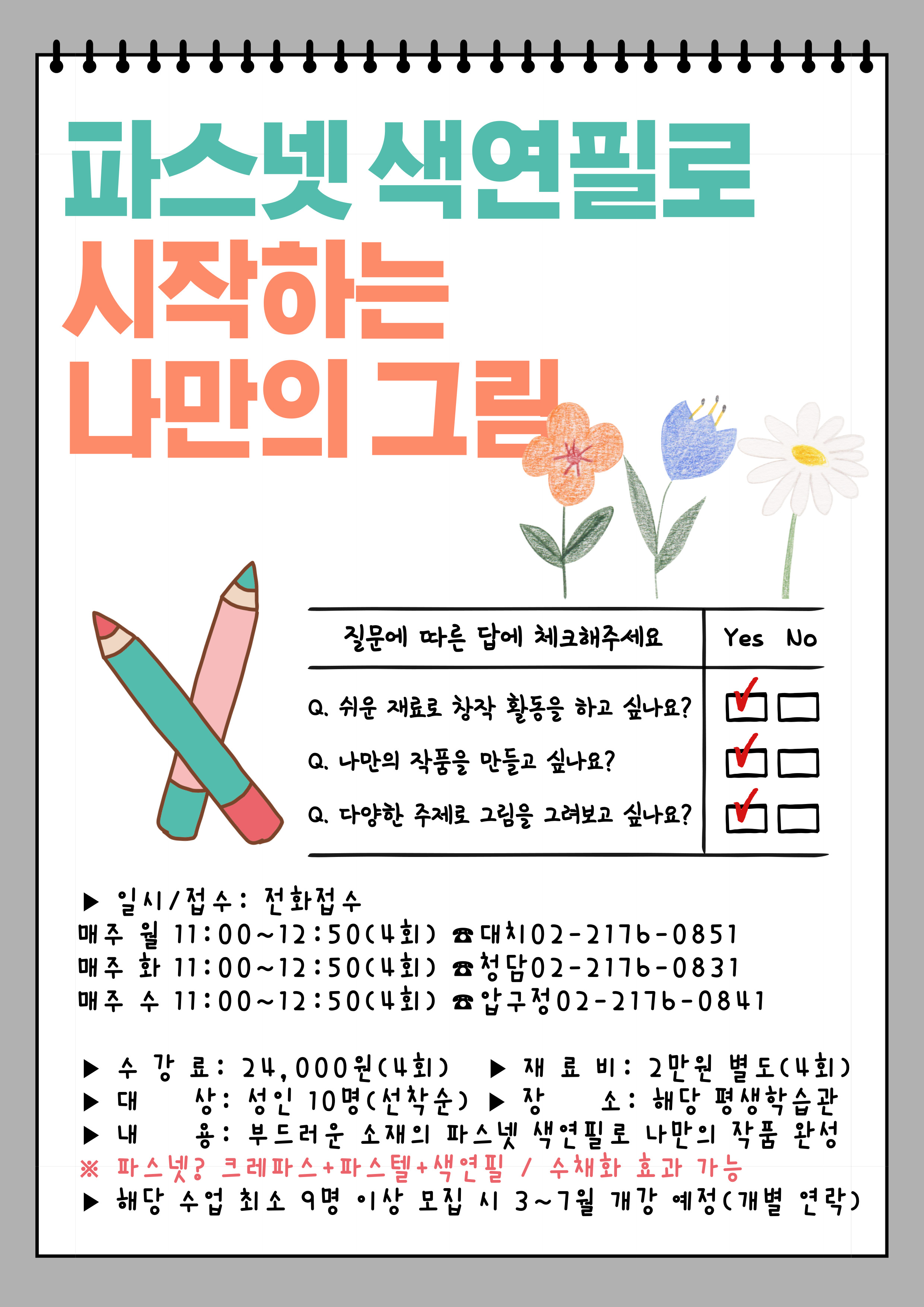 ▶ 강좌명: 파스넷 색연필로 시작하는 나만의 그림(3월)▶ 접수: 강남구통합예약사이트/로그인필수(https://url.kr/xoyb8i) 및 대치평생학습관 4층 상담매니저실
