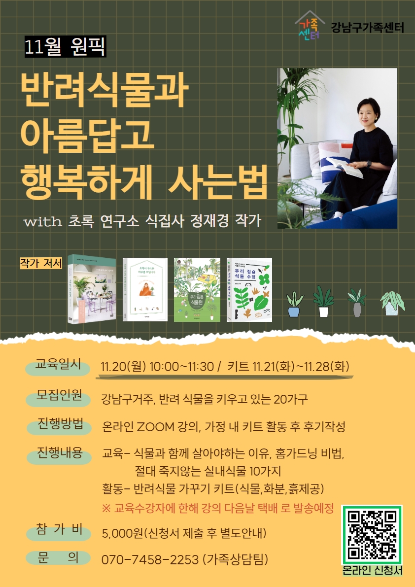 - 내용: 교육-식물과 함께 살아야하는 이유, 홈가드닝 비법, 절대 죽지않는 실내식물 10가지 / 키트- 반려식물 가꾸기(스킨답서스 식물키트)