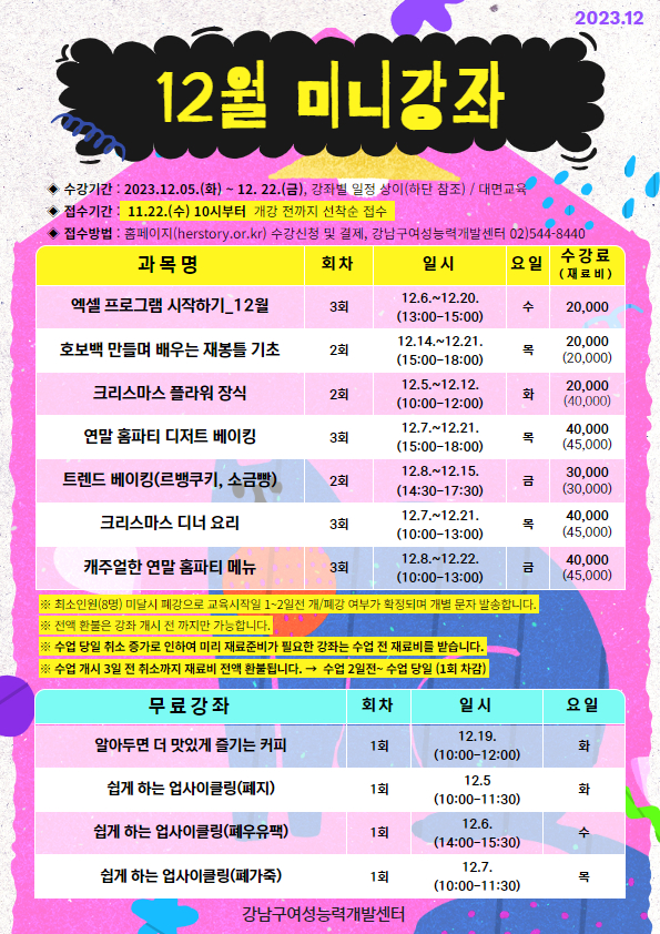 ‣수강기간 : 2023.12.05.(화)~12.22.(금) 강좌별 일정 상이(하단참조)