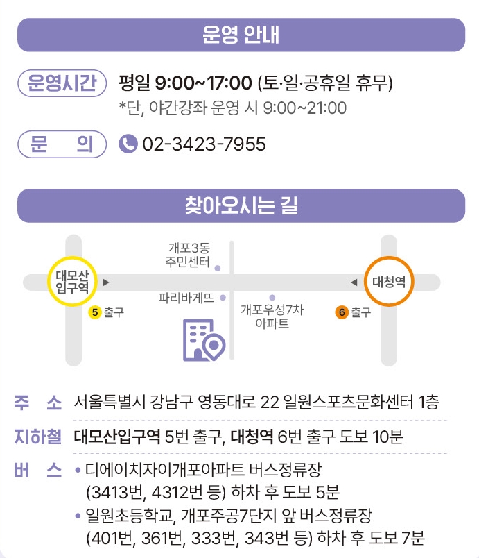 | 일원평생학습센터 | 서울특별시 강남구 영동대로 22 (개포디에이치자이 일원스포츠문화센터 1층) |