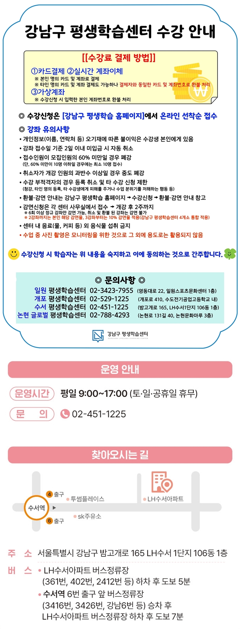 | 담당자 | 수서평생학습센터 주무관 | 문의전화 | 02-451-1225 |