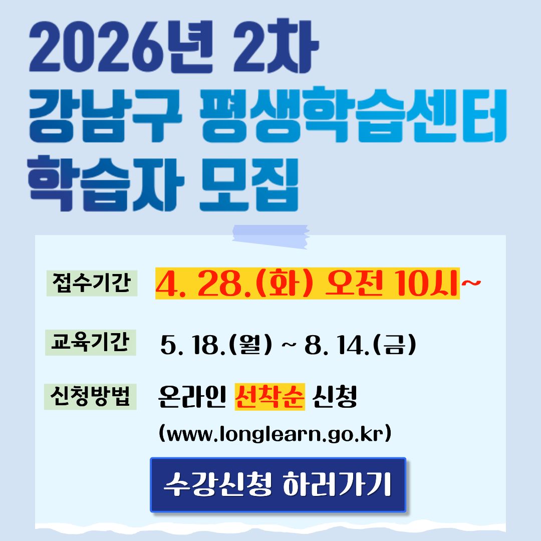 - 2026년 2차 강남구 평생학습센터(4개소) 학습자 모집 안내 2026-04-13