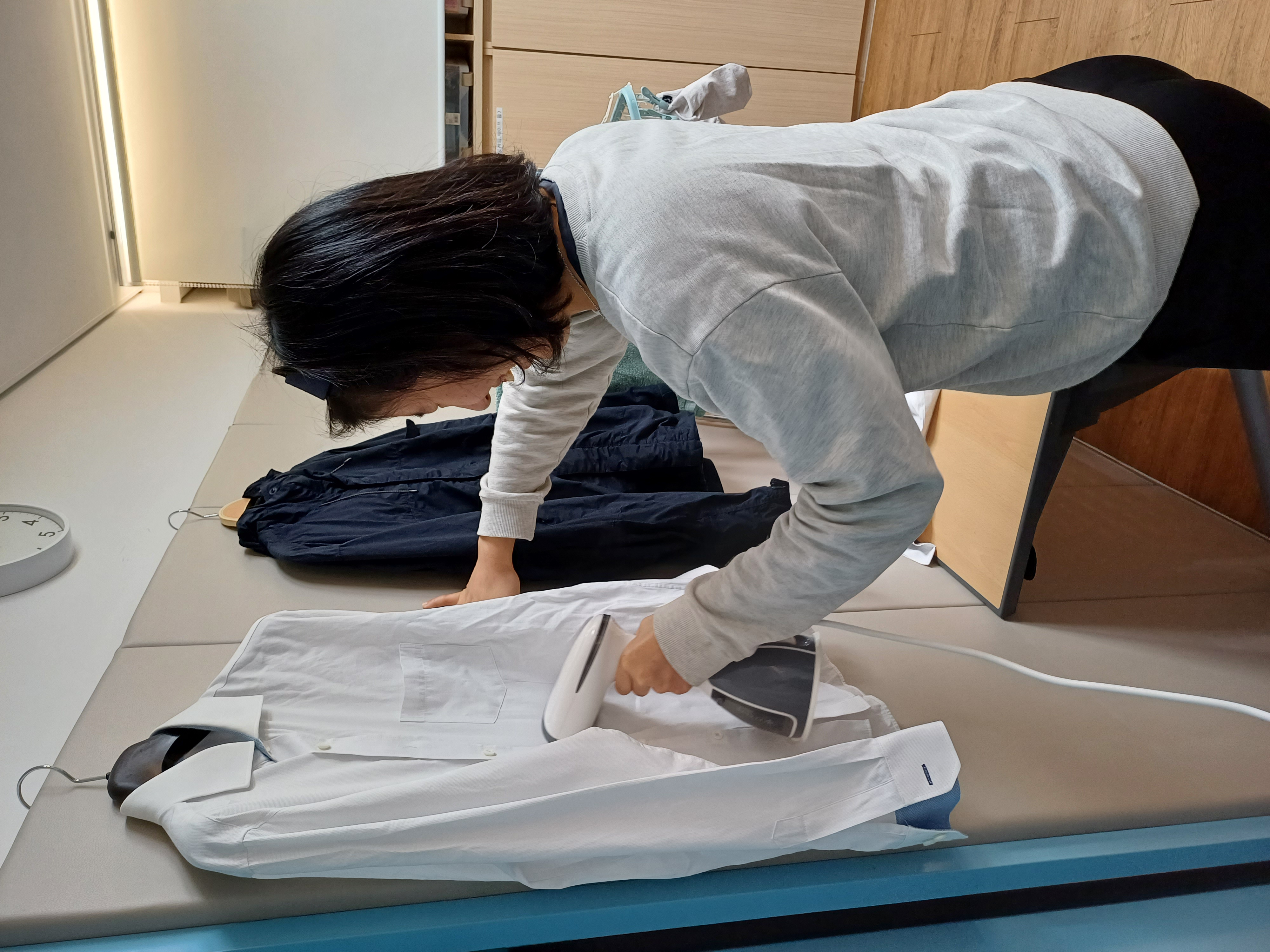 부모님들의 지원을 받아 깨끗한 옷을 입고 생활하는 교육생들이 이번에는 직접 세탁기를 사용해보고 건조대에 빨래를 널어보았으며 선생님과 함께 조심조심 스팀 다리미도 사용해보았습니다.