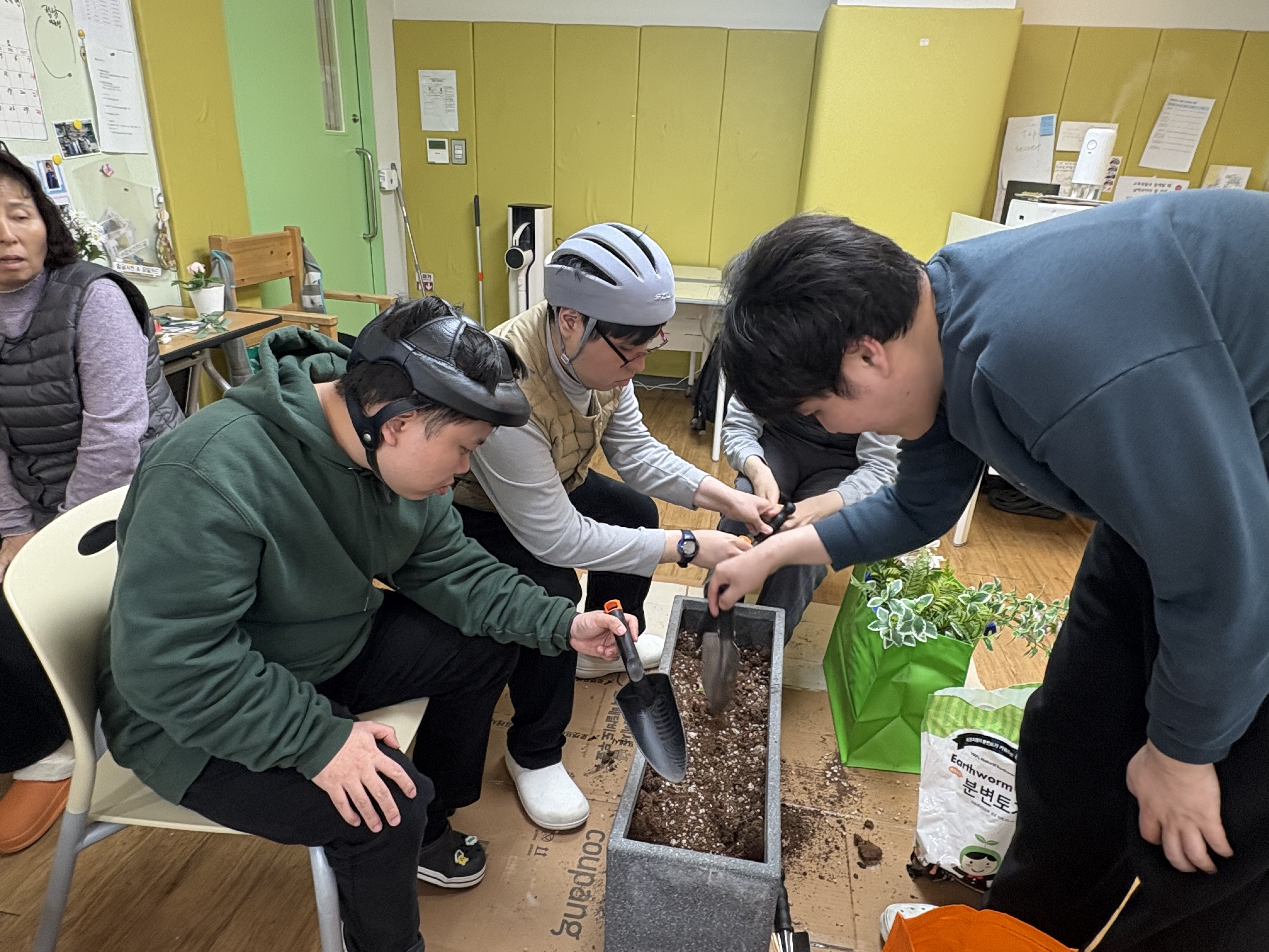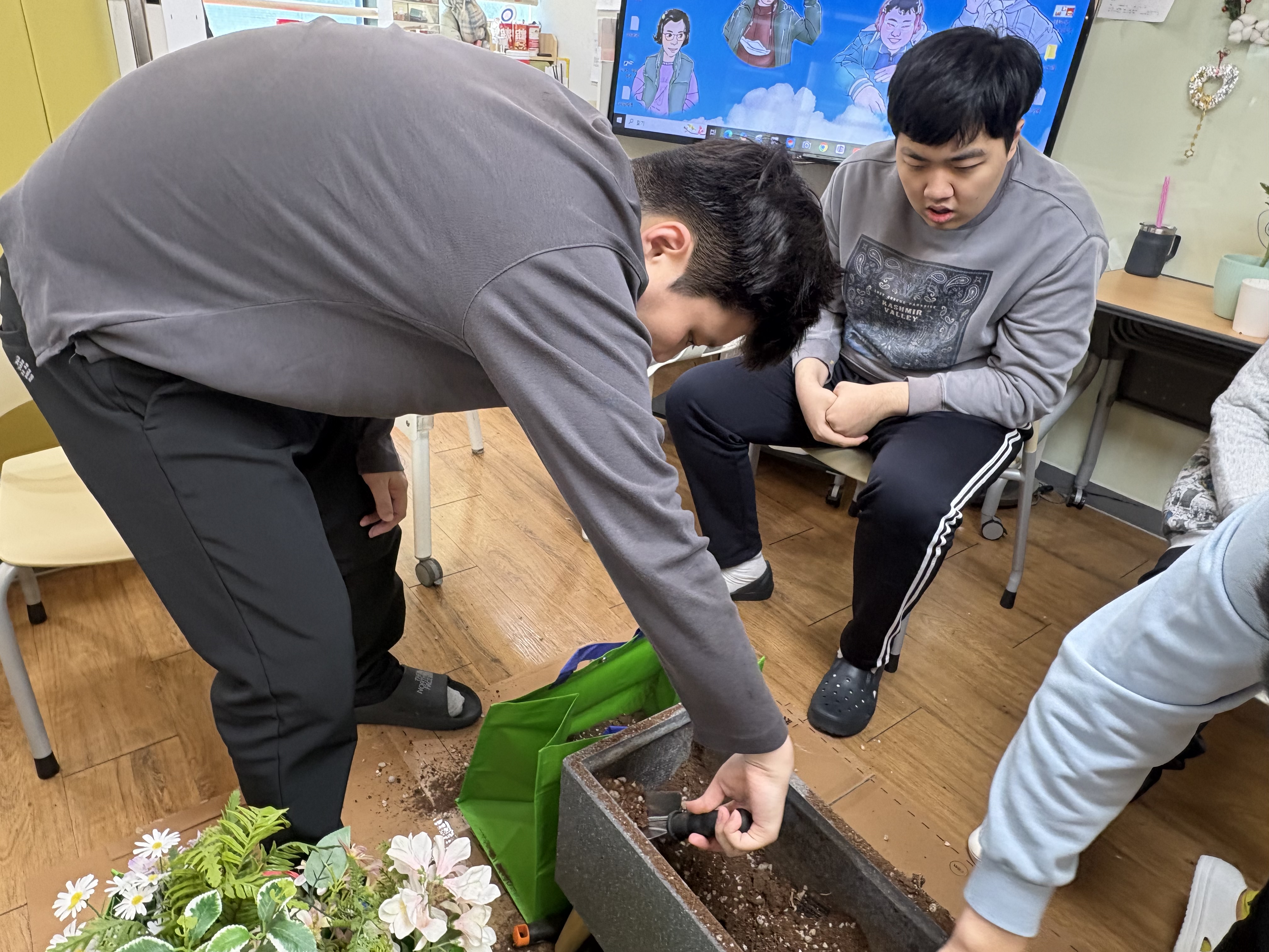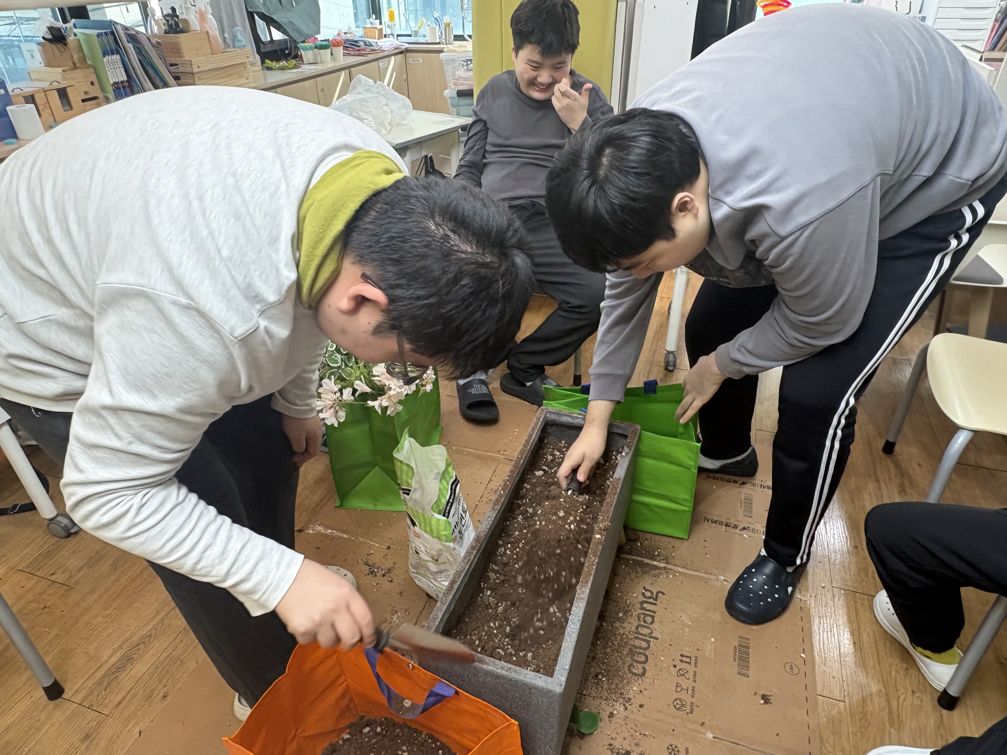 이번주 원예 수업 시간에는 배양토를 혼합하여 토양을 정비하고,