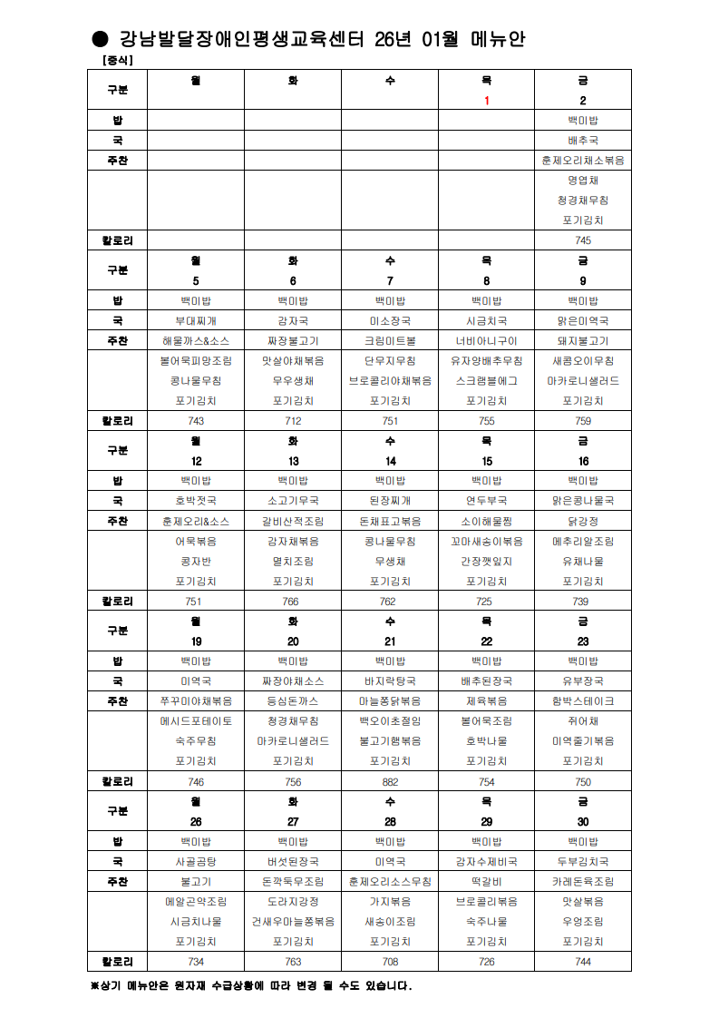 ※ 위 식단 외 샐러드 및 추가메뉴 1~3개를 센터 자체적으로 제공합니다.