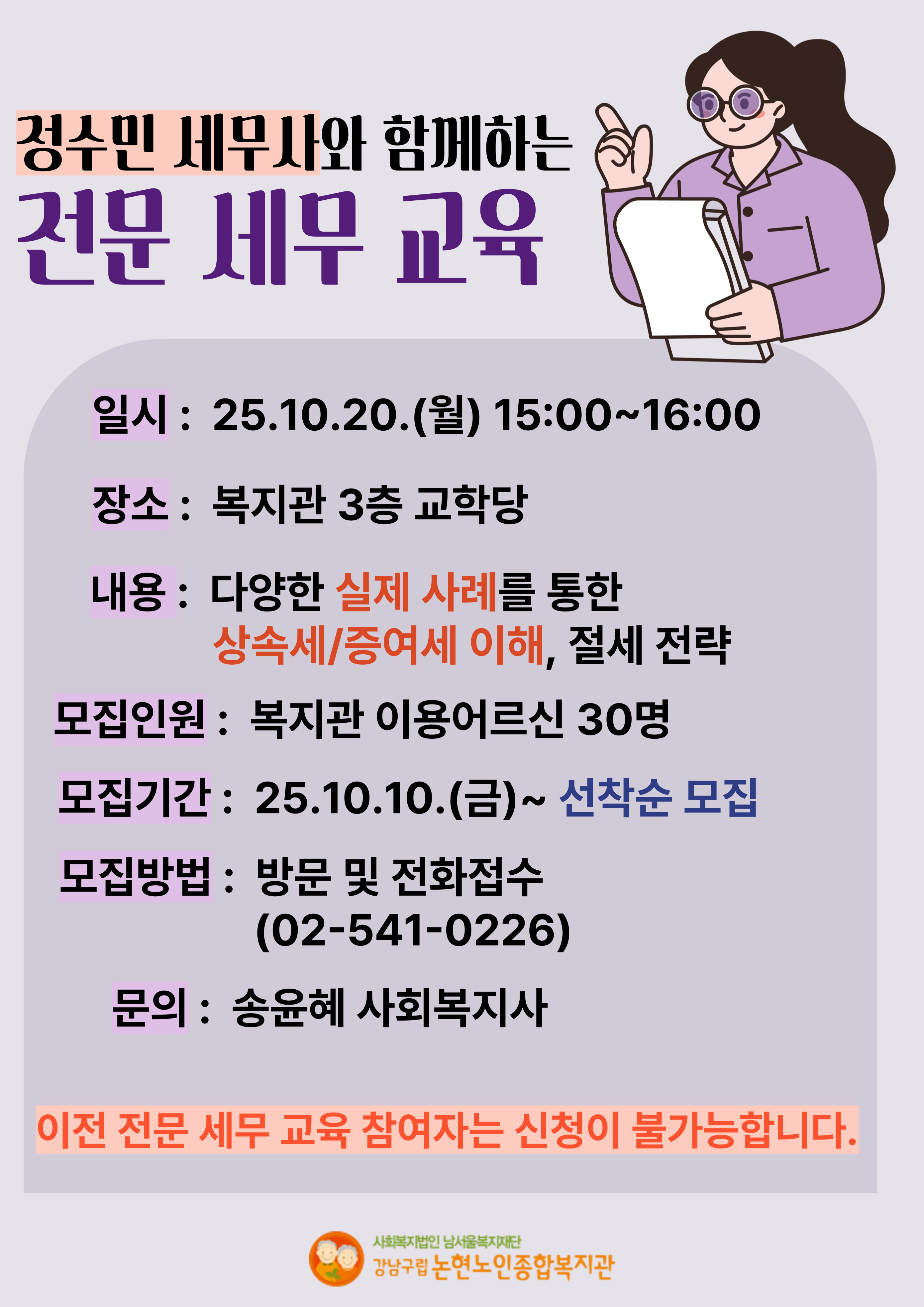 전문세무교육(2회차) 참여자 모집 [상담 및 정서생활지원사업]