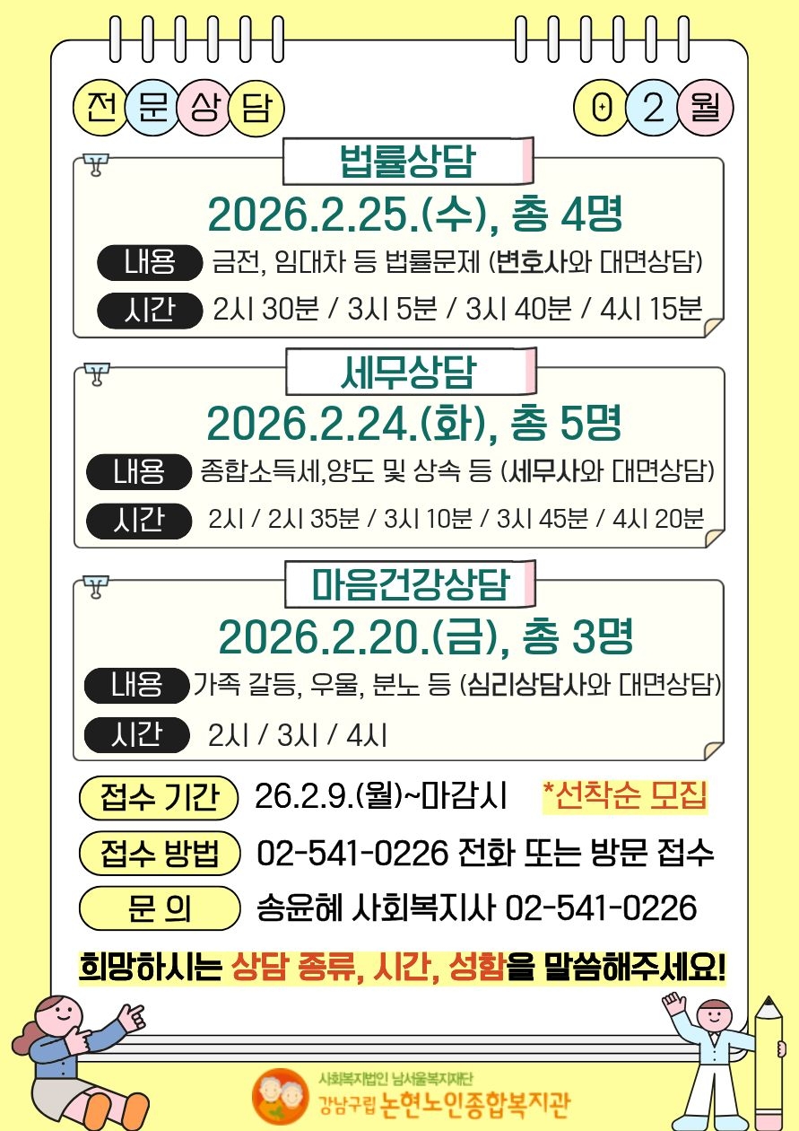 2월 무료 전문상담(법률,세무,마음건강) 참여자 모집 [상담 및 정서생활지원사업]