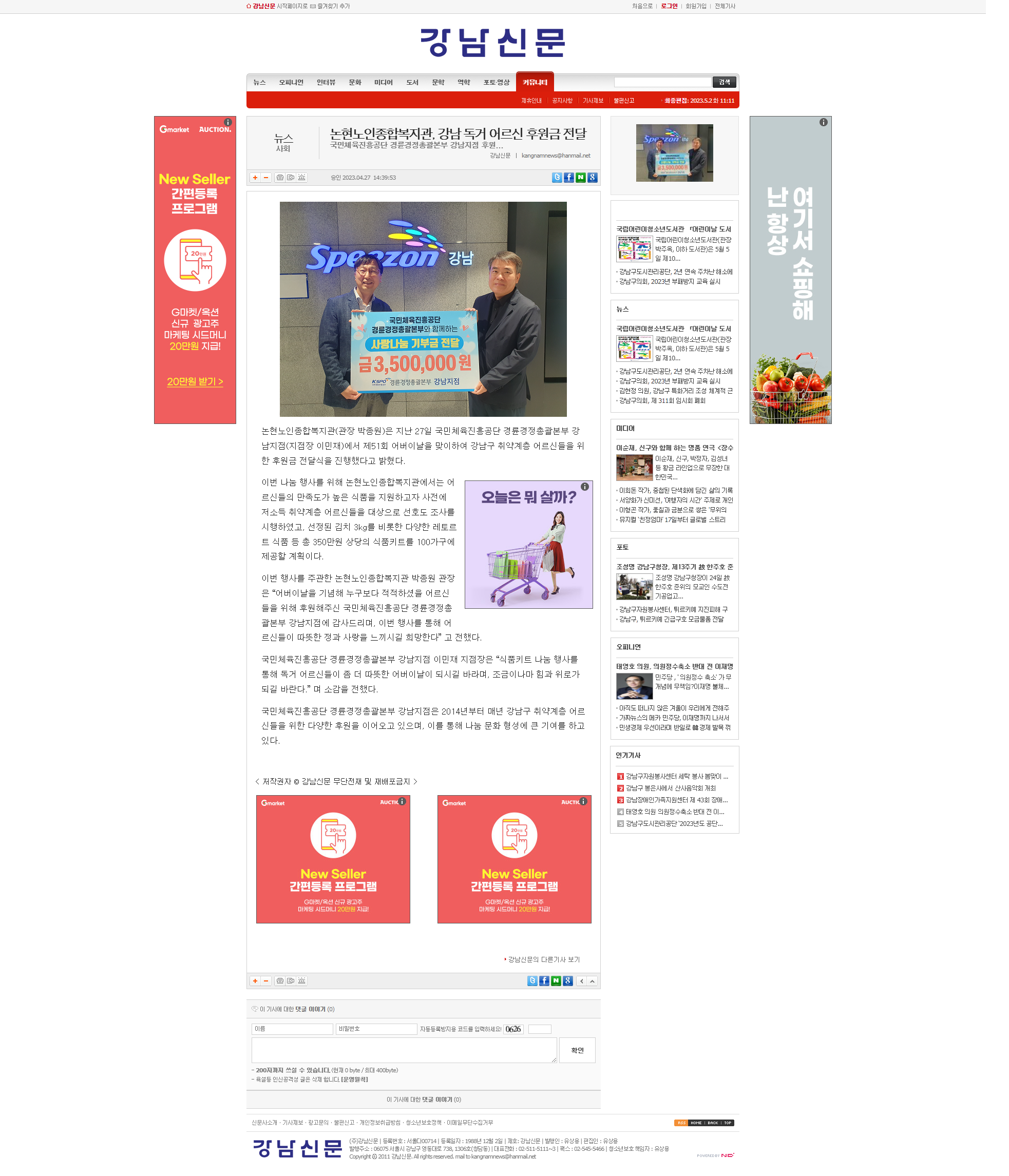 [강남신문] 논현노인종합복지관, 강남 독거 어르신 후원금 전달