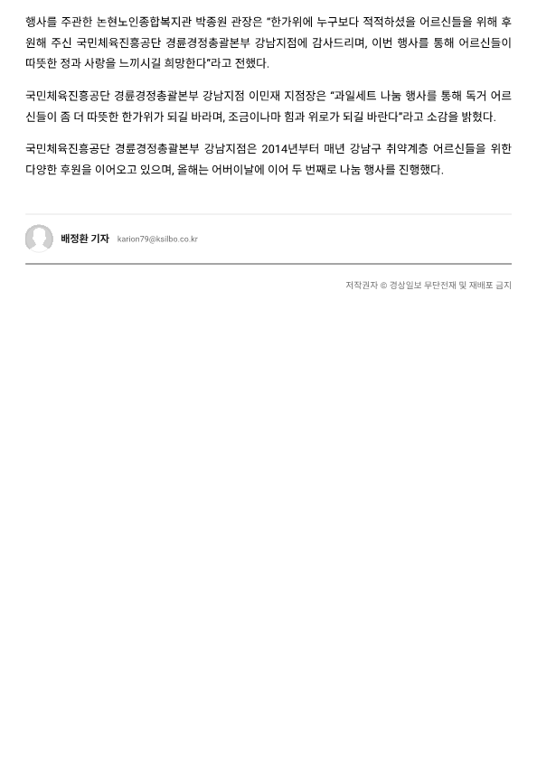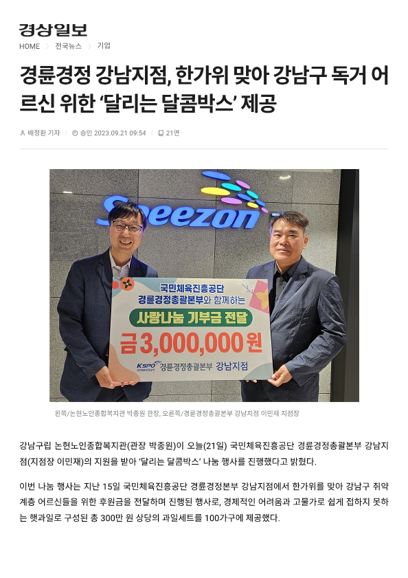 [경상일보] 경륜경정 강남지점, 한가위 맞아 강남구 독거 어르신 위한 ‘달리는 달콤박스’ 제공