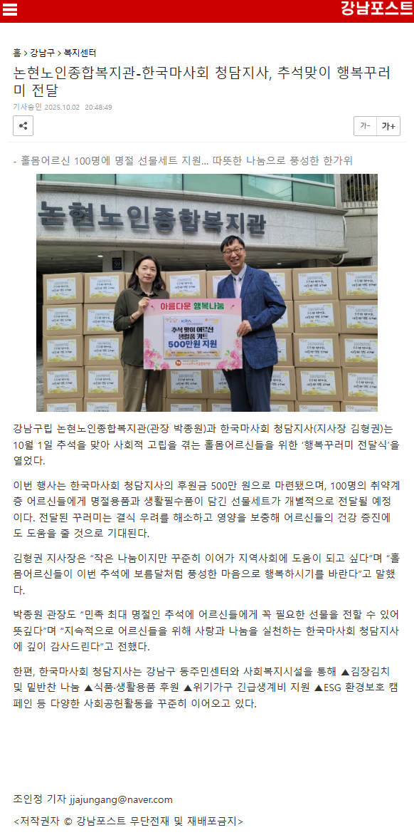 [강남신문] 논현노인종합복지관-한국마사회 청담지사, 추석맞이 행복꾸러미 전달식 개최