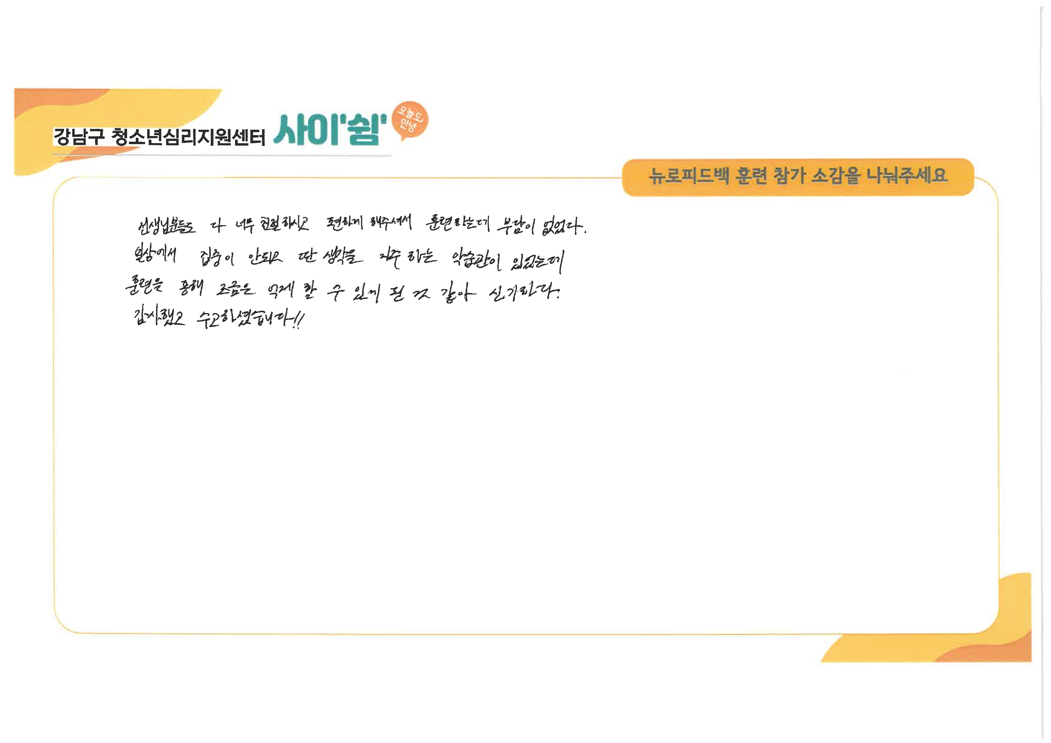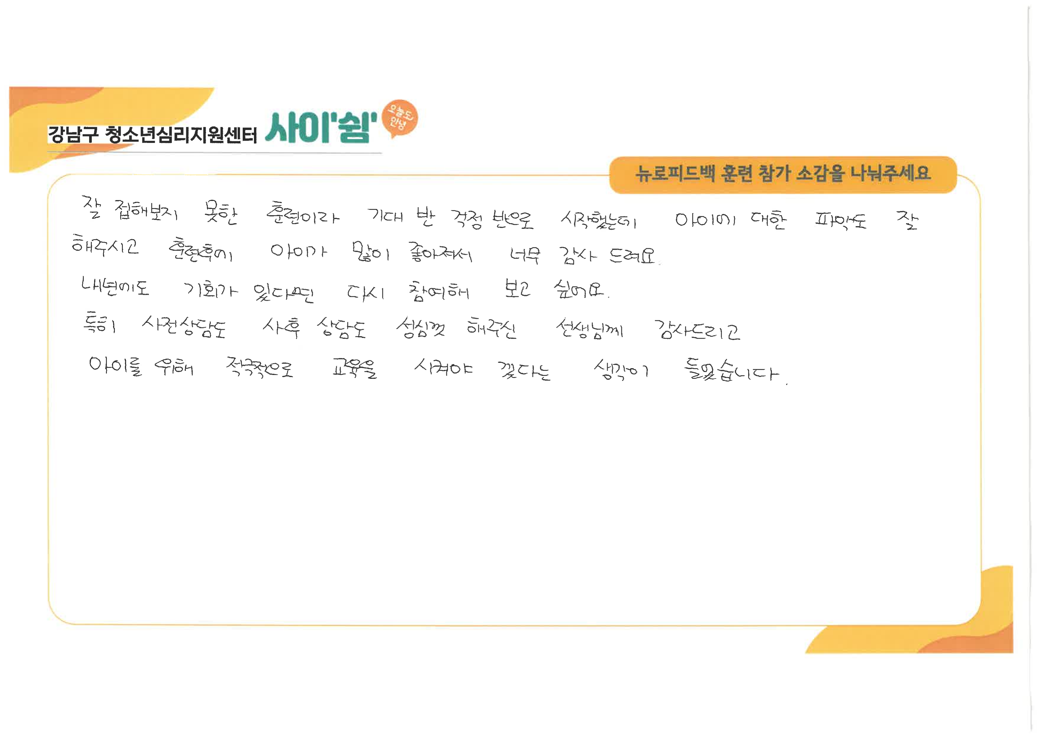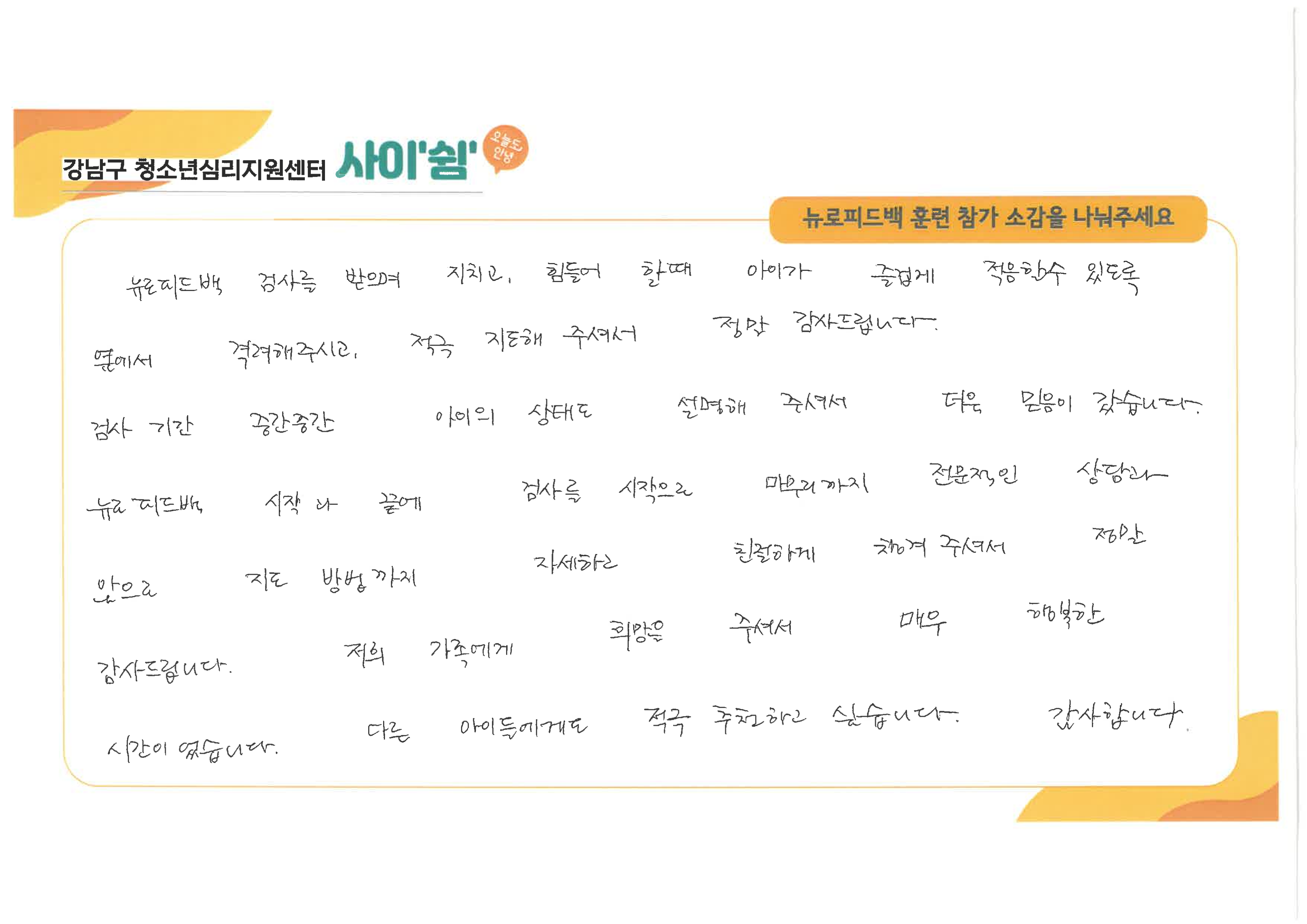 2025년도 뉴로피드백 훈련에 참여한 아동·청소년과 보호자 모두 전반적으로 만족스럽다는 반응을 보였습니다.