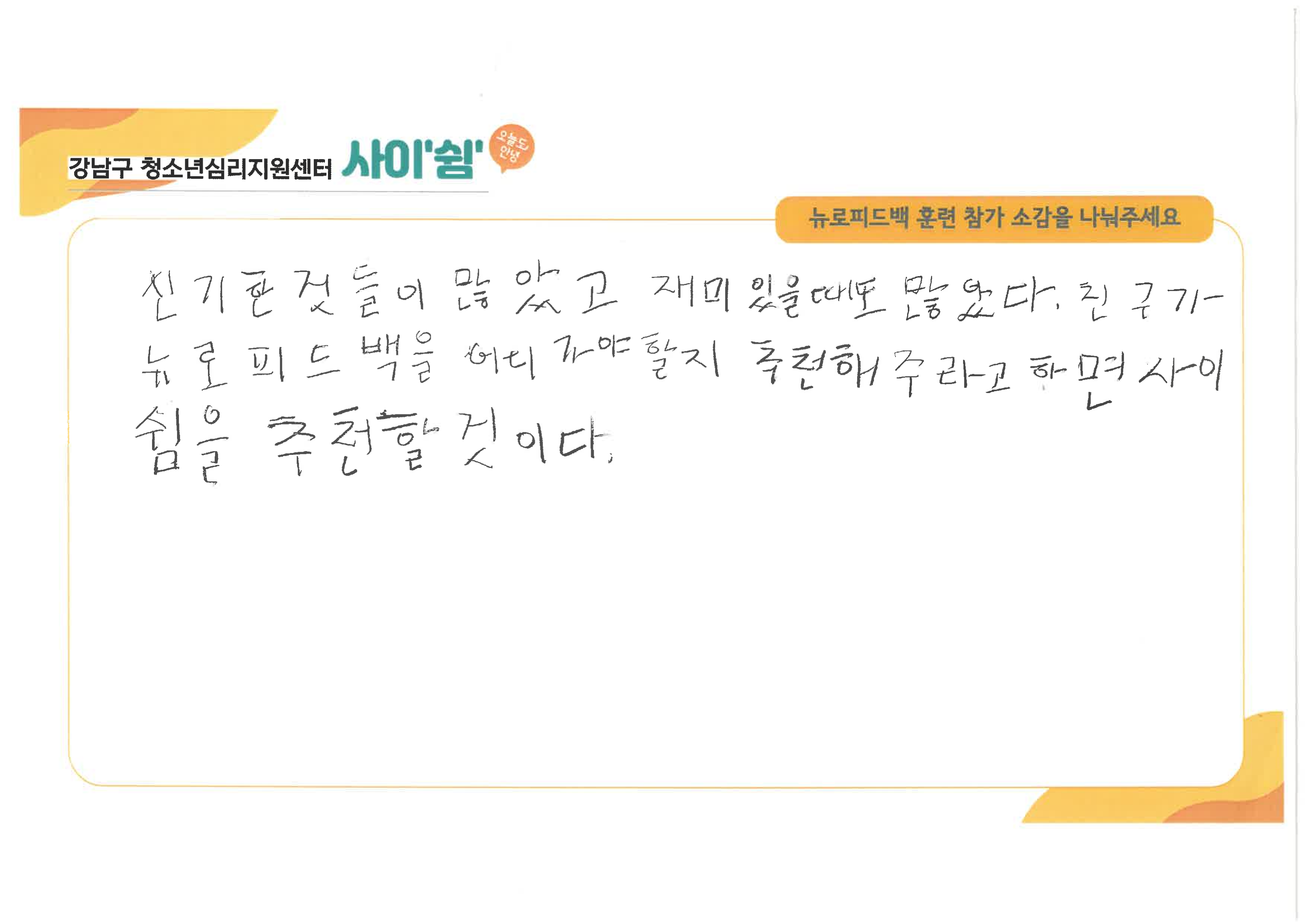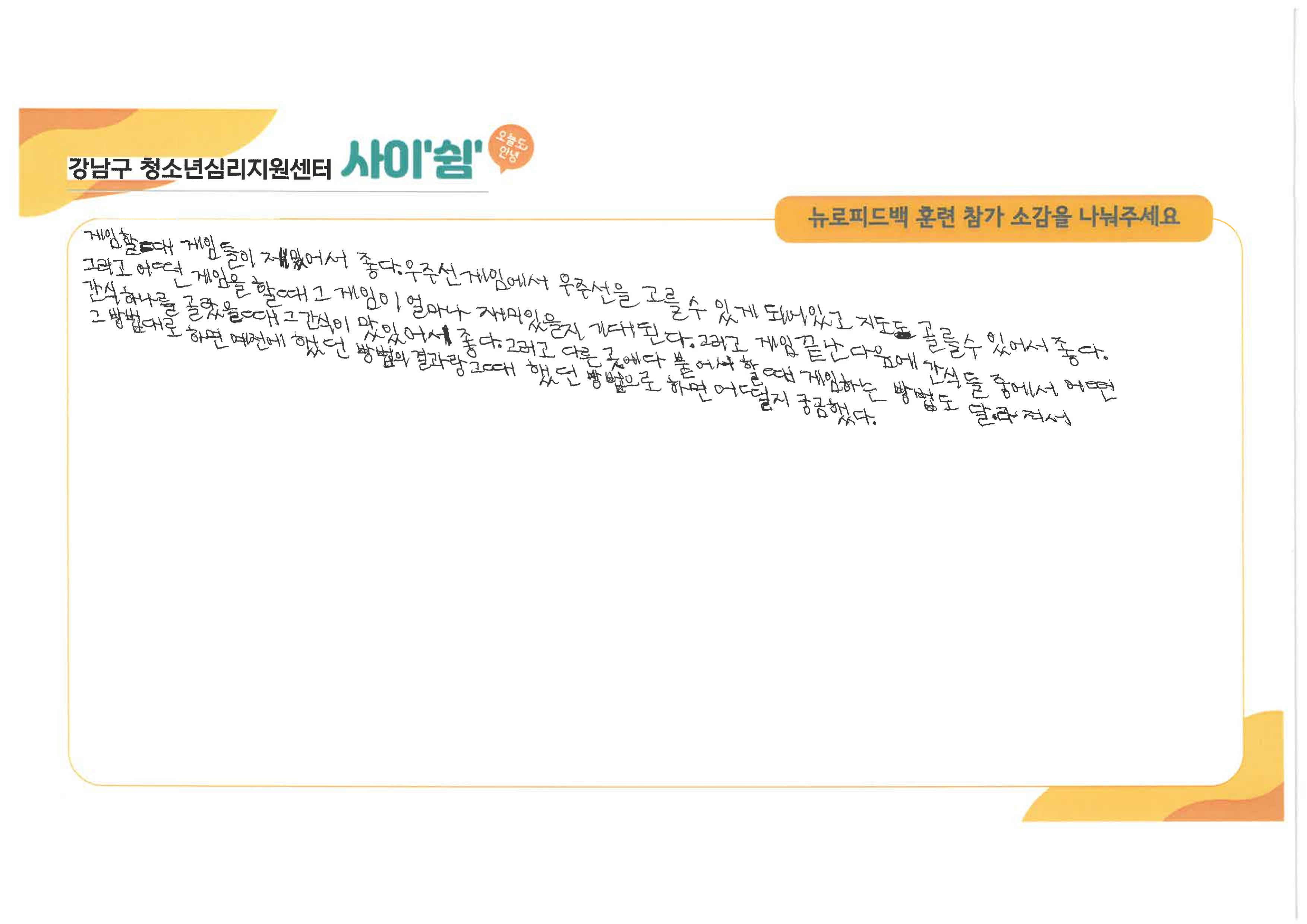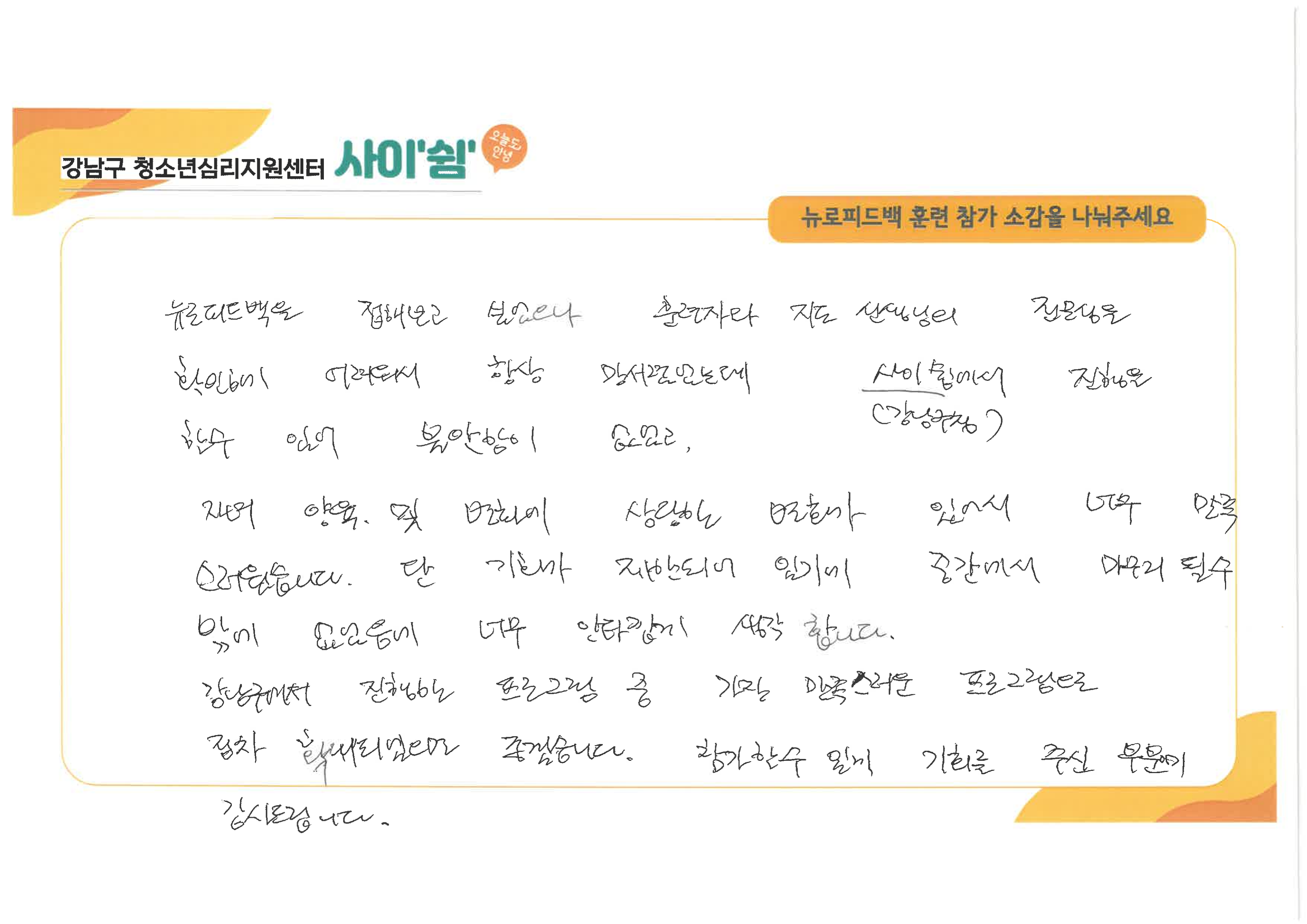 2025년도 뉴로피드백 훈련에 참여한 아동·청소년과 보호자 모두 전반적으로 만족스럽다는 반응을 보였습니다.