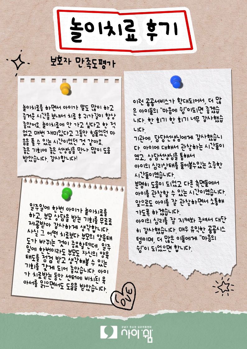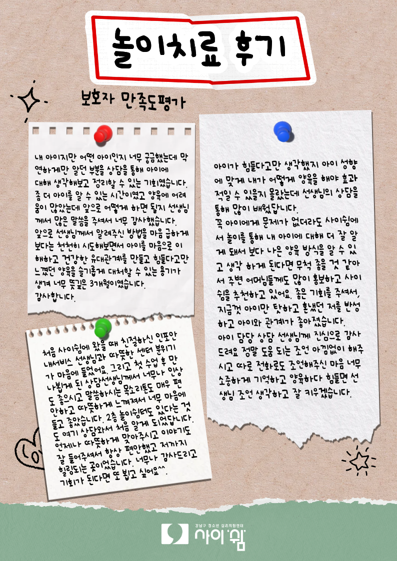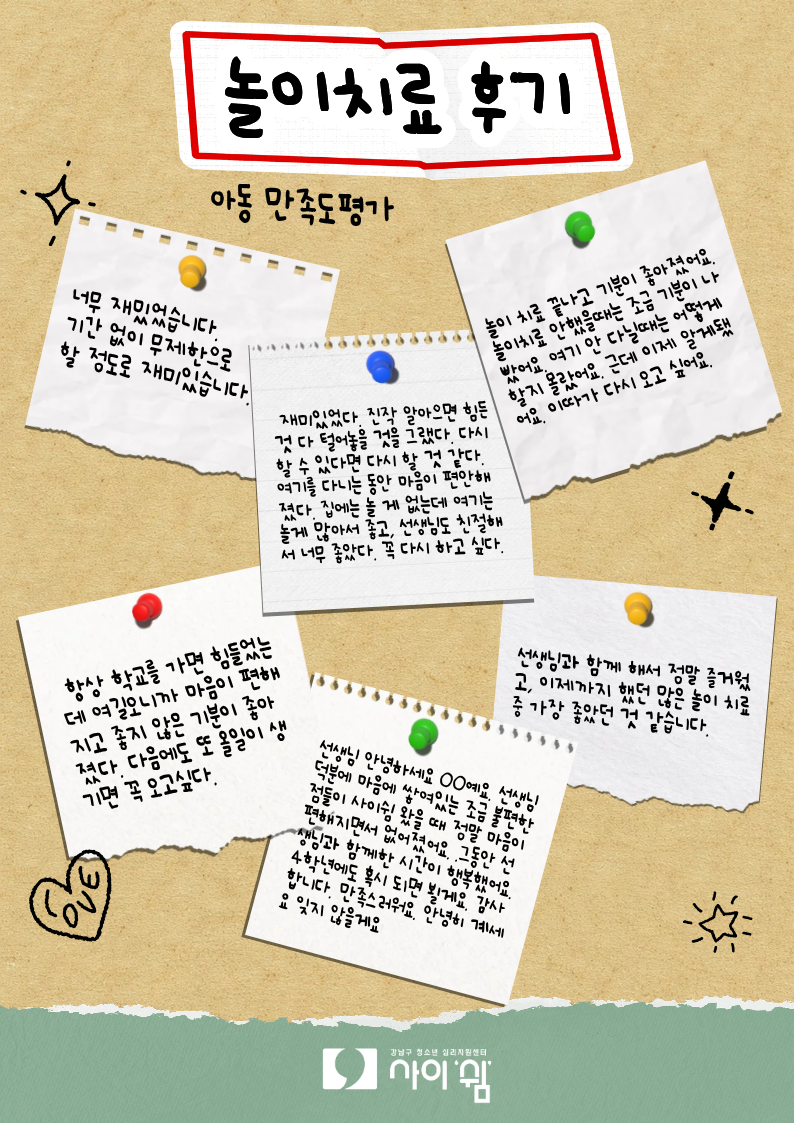 2025년도 초등학생을 대상으로 진행된 놀이치료에 참여한 아동과 보호자 모두 치료 과정이 도움이 되었다는 이야기가 많았습니다.