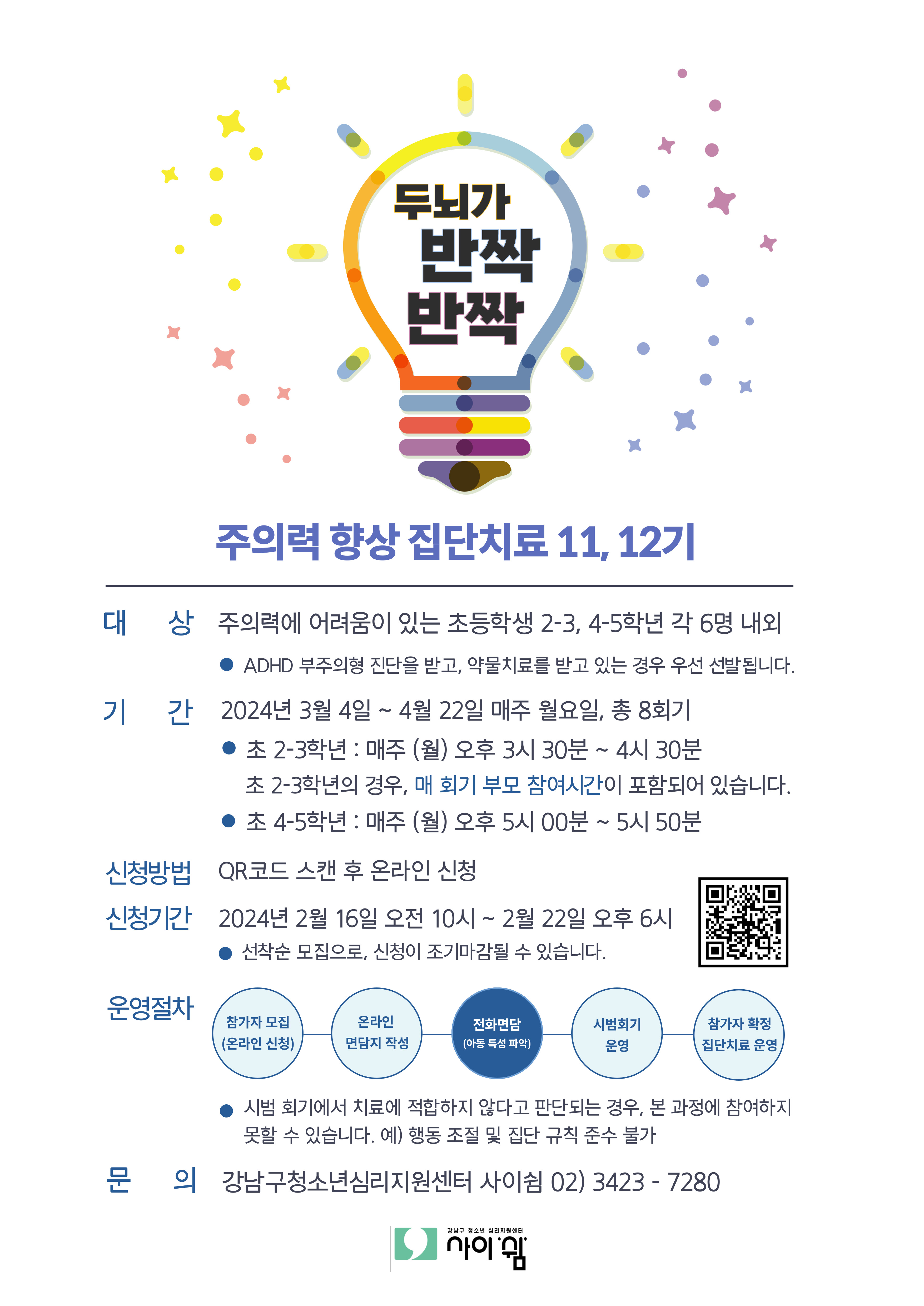 ![2024년 상반기 주의력 향상 집단프로그램 [두뇌가 반짝반짝] 11-12기 참가자 모집(초등학교2-3,4-5학년) 전자점자뷰어보기](/assets/images/common/braille_btn.png)