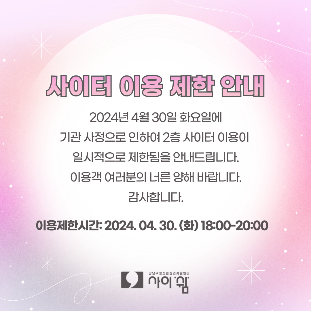 2024년 4월 30일 화요일에 기관 사정으로 인하여 2층 사이터 이용이 일시적으로 제한됨을 안내드립니다.
