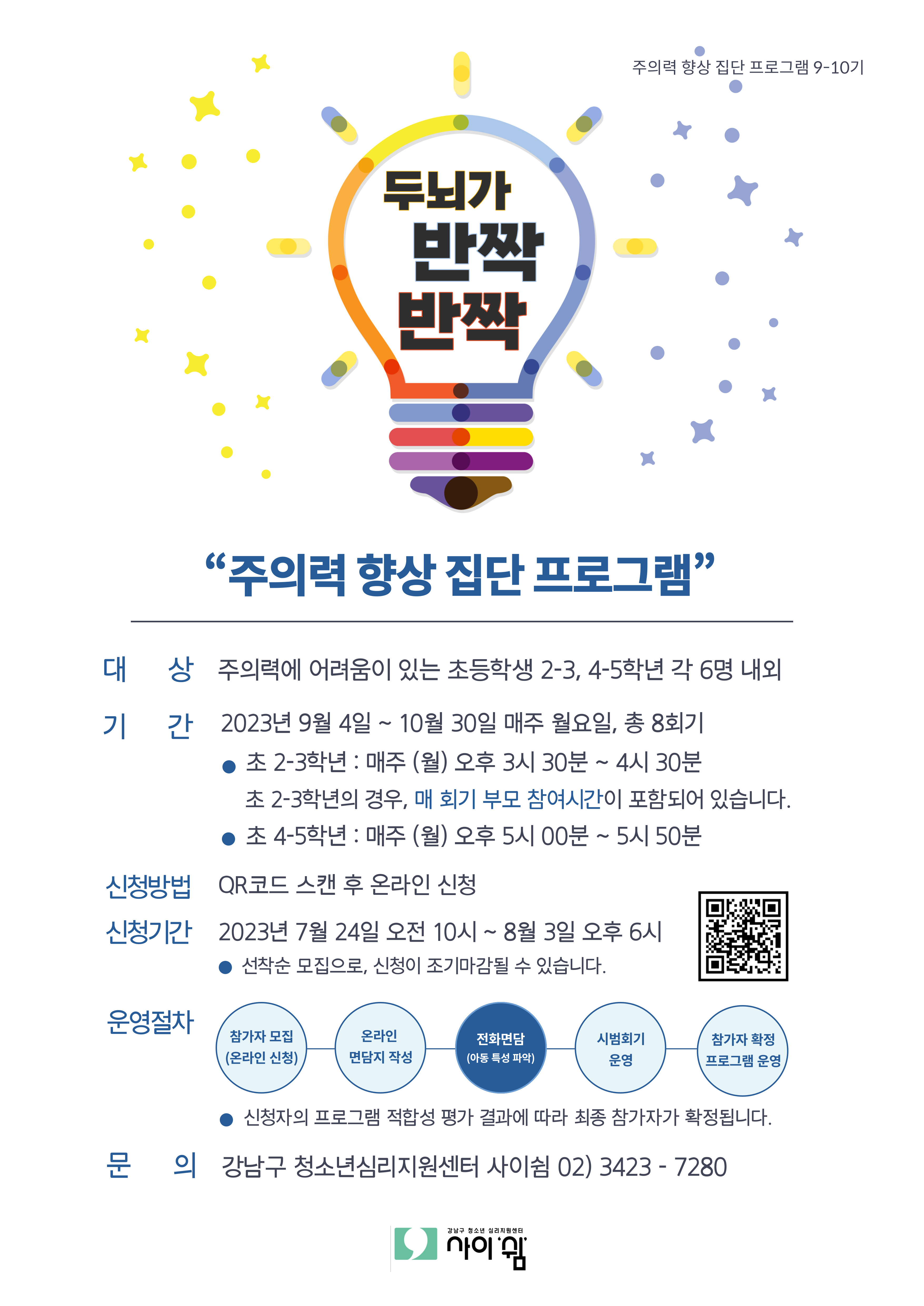 주의력 향상 집단 프로그램을 운영합니다. 관심 있는 분들의 많은 신청 바랍니다.