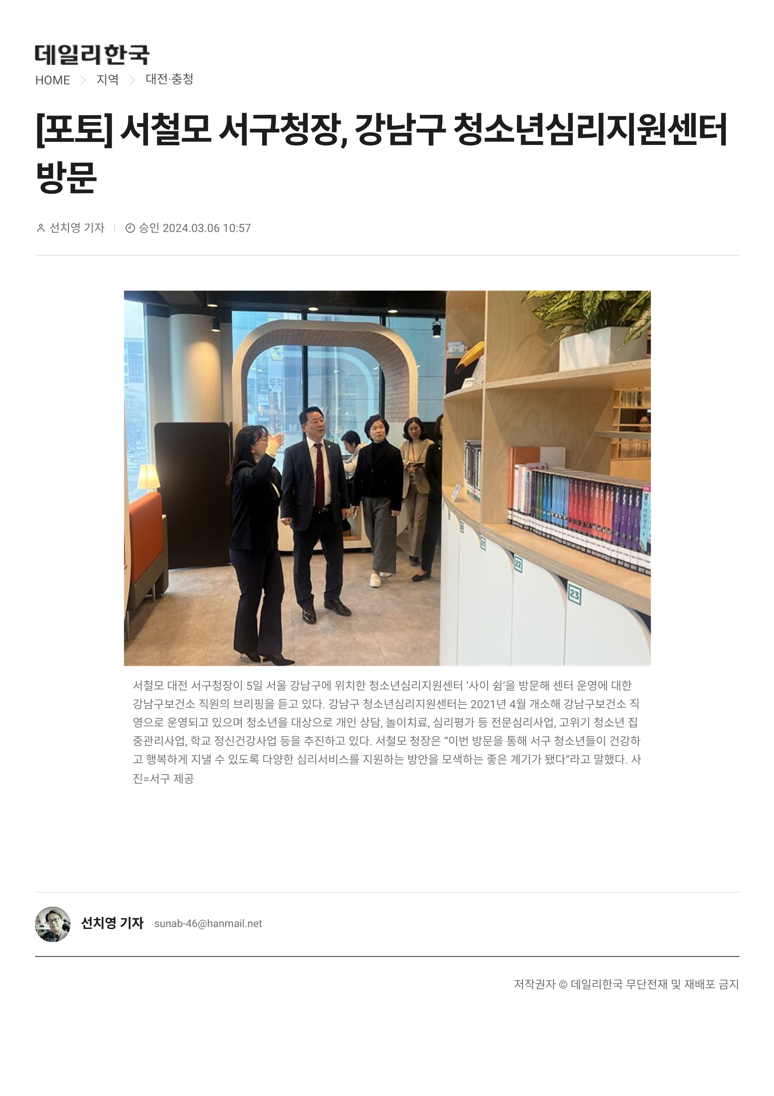 2024-03-06][충남일보] 서철모 서구청장, 강남구 청소년심리지원센터 방문