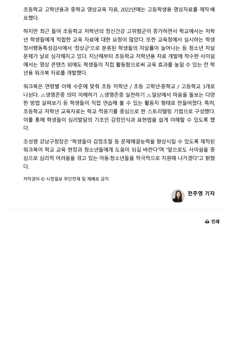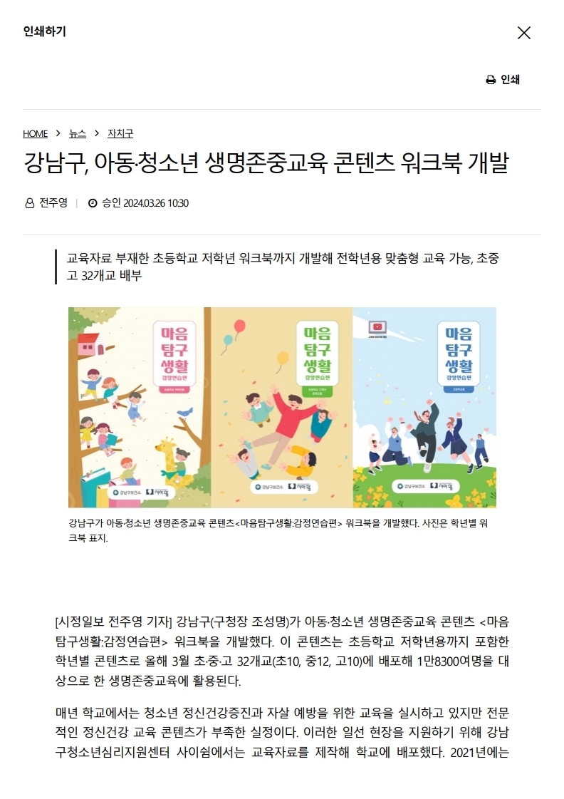 2024-03-26][시정일보] 강남구, 아동·청소년 생명존중교육 콘텐츠 워크북 개발