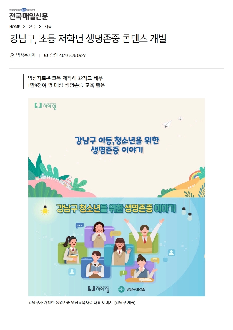 2024-03-26][전국매일신문] 강남구, 초등 저학년 생명존중 콘텐츠 개발