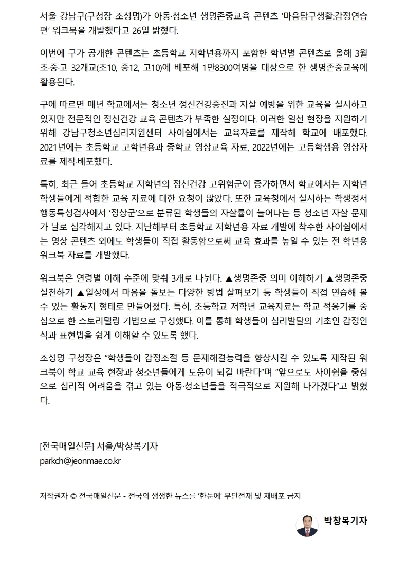 2024-03-26][문화경제] 서울 강남구, 초등 저학년용 생명존중교육 콘텐츠 개발