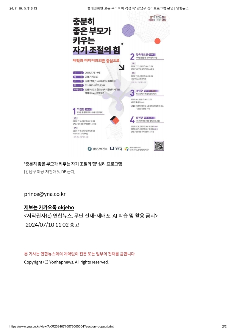 2024-07-10][연합뉴스] “휴대전화만 보는 우리아이 걱정 뚝” 강남구 심리프로그램 운영