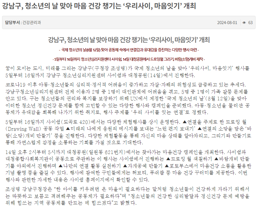 2024-08-01][강남구청][보도자료] 강남구, 청소년의 날 맞아 마음 건강 챙기는 ‘우리사이, 마음잇기’ 개최