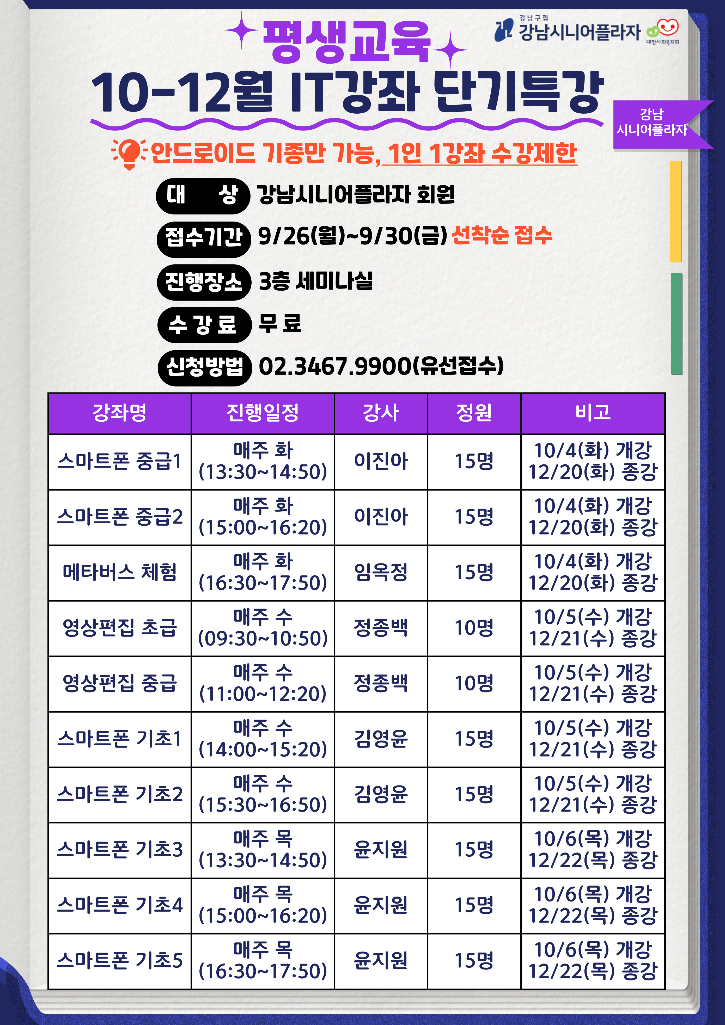 대상 : 강남시니어플라자 회원