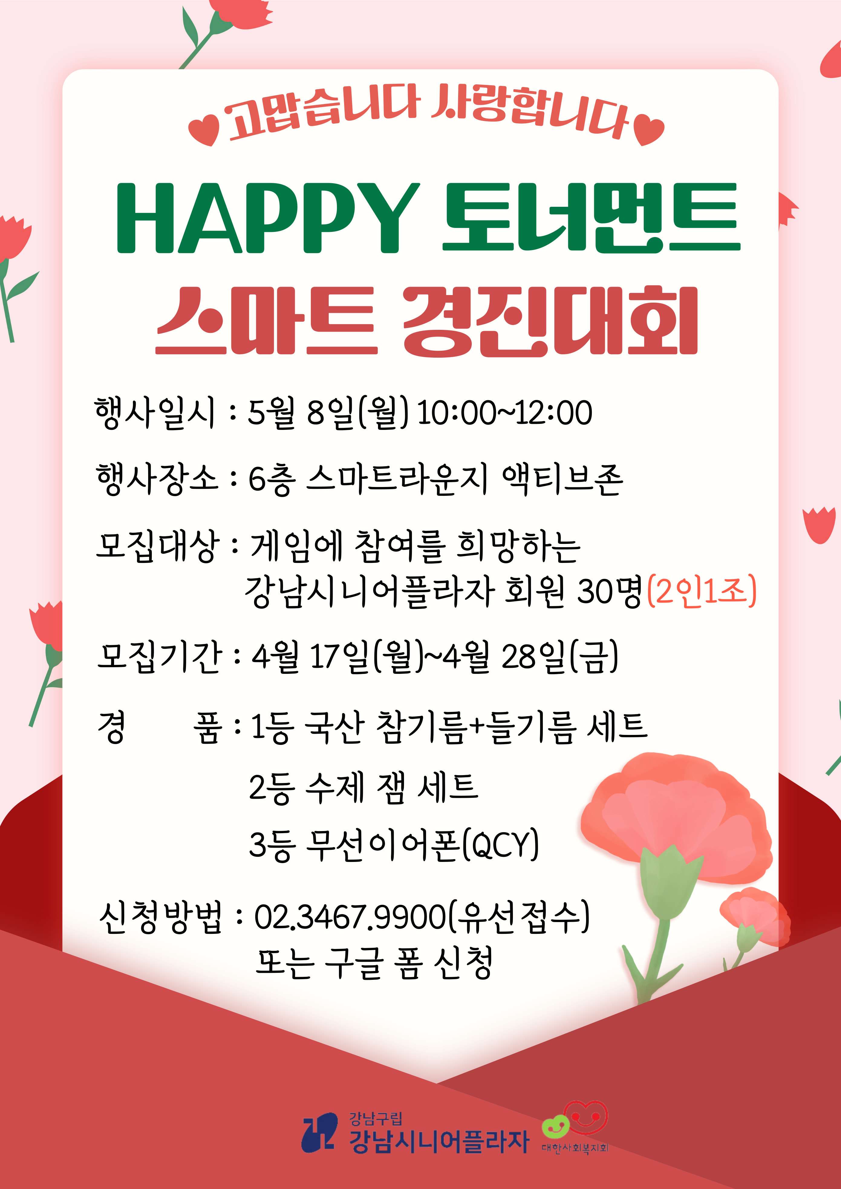 모집대상 : 게임에 참여를 희망하는 강남시니어플라자 회원 30명(2인 1조)