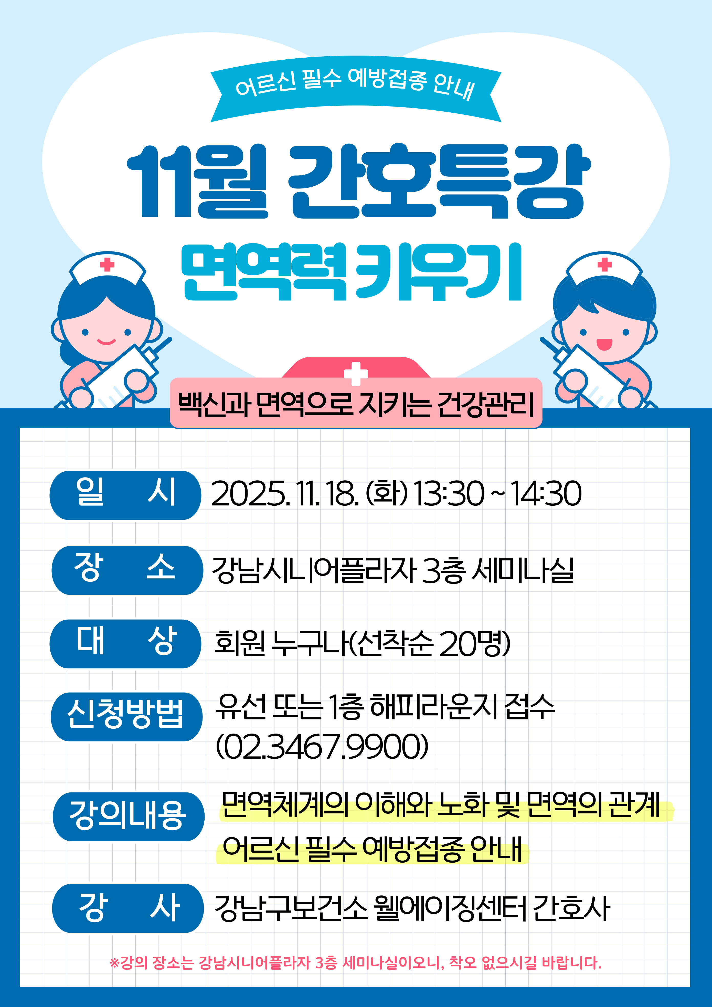※강의는 강남시니어플라자 3층 세미나실에서 진행되오니, 착오 없으시길 바랍니다.
