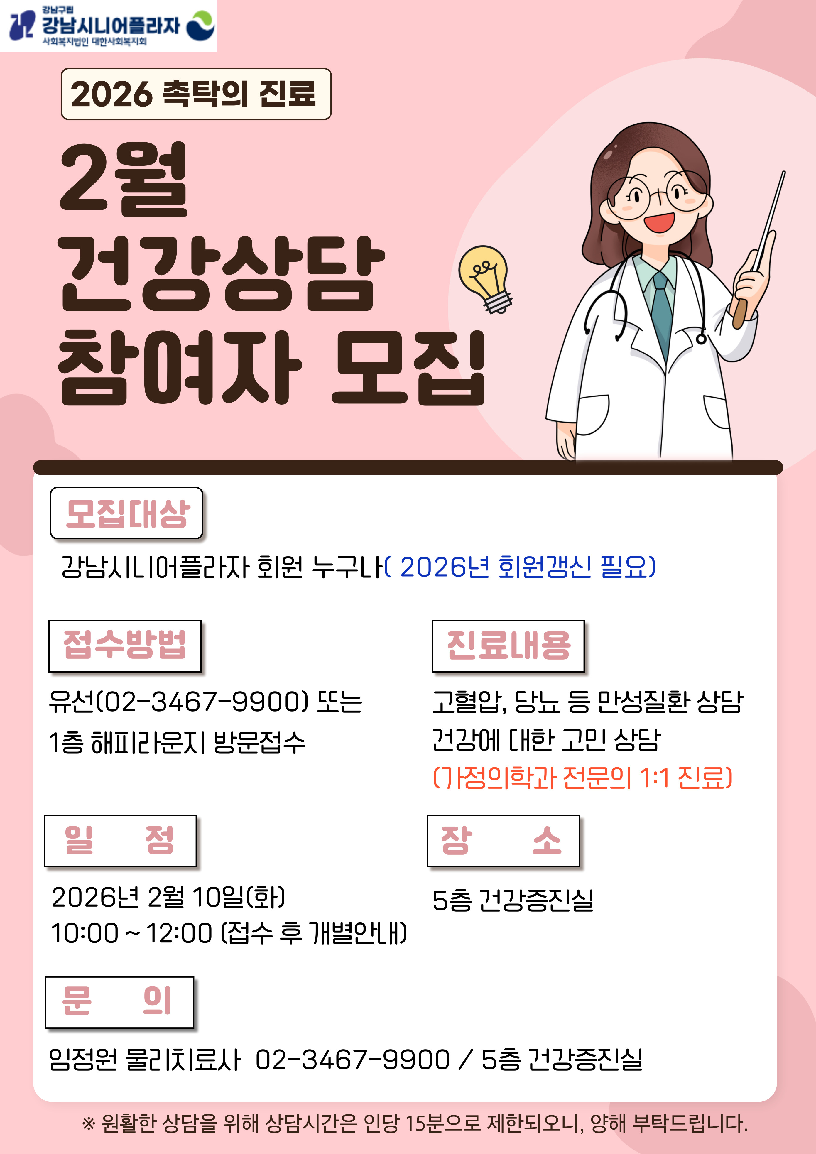 모집대상 : 강남시니어플라자 회원 누구나(2026년 회원갱신 필요)