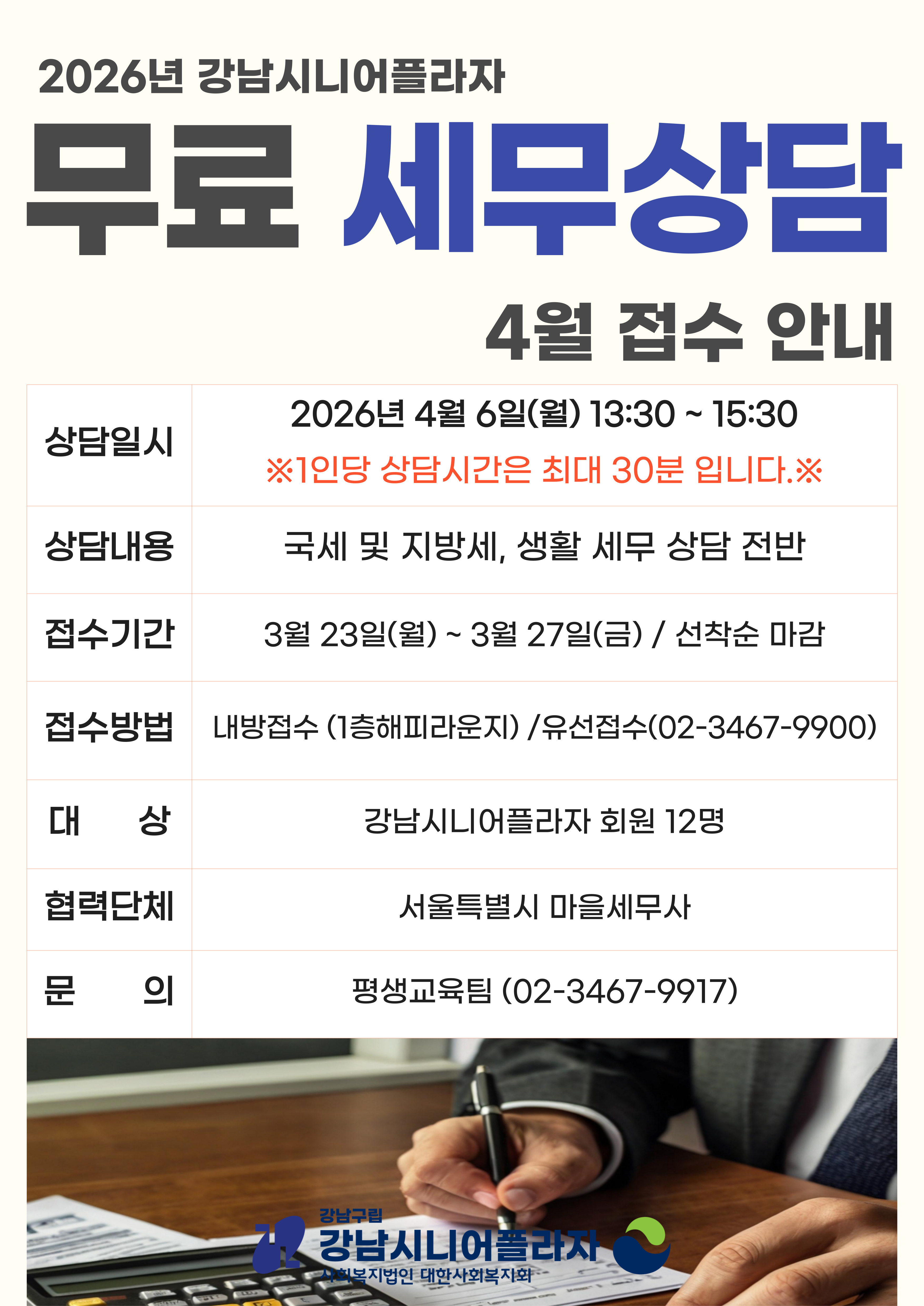 평생교육팀에서는 4월 아래의 일정과 같이 서울특별시 마을세무사 연계를 통한 1:1 생활 세무 상담을 무료로 진행합니다.