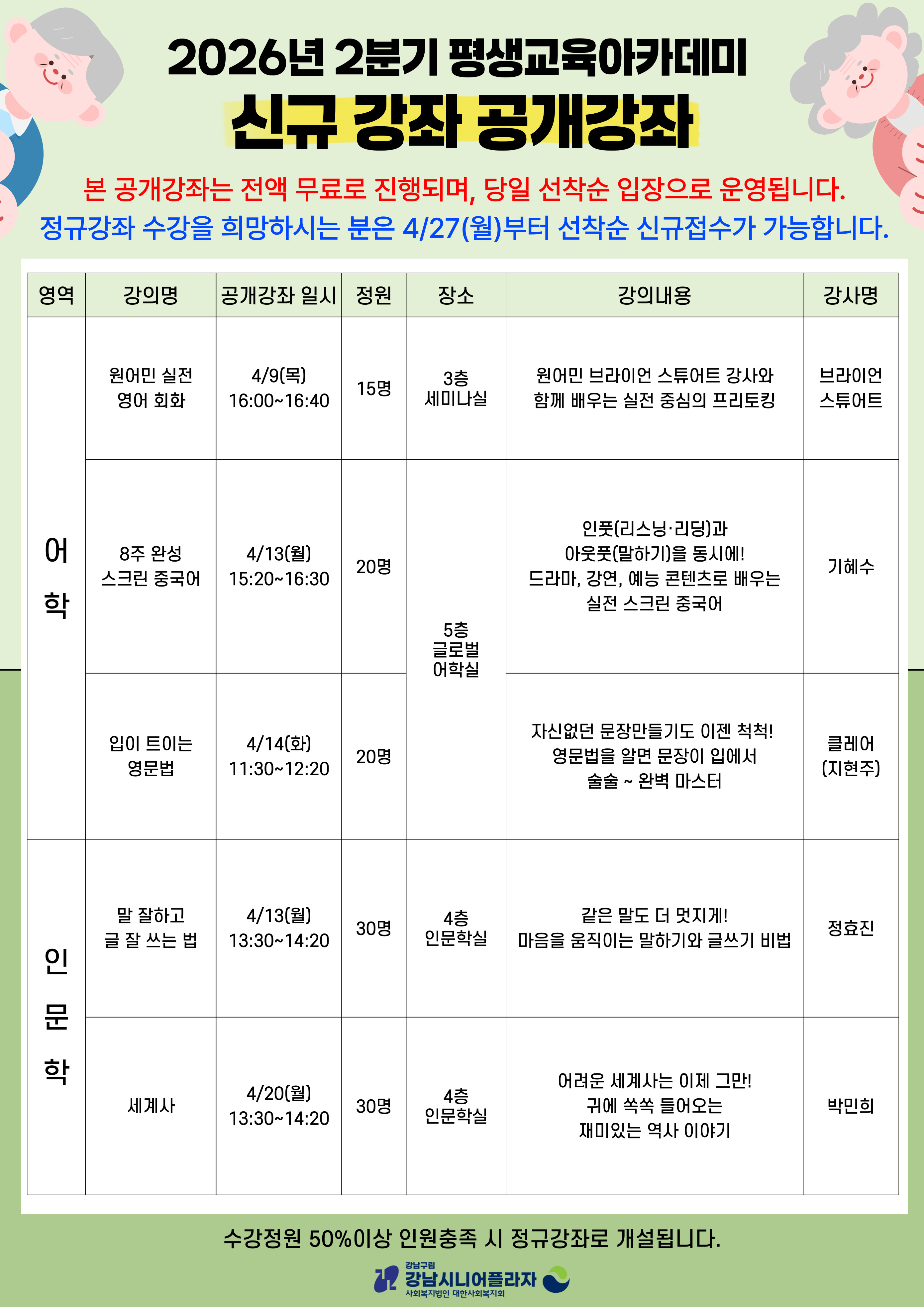 강남시니어플라자에서는 26년도 2분기 신규 강좌에 대한 공개강좌를 진행합니다.