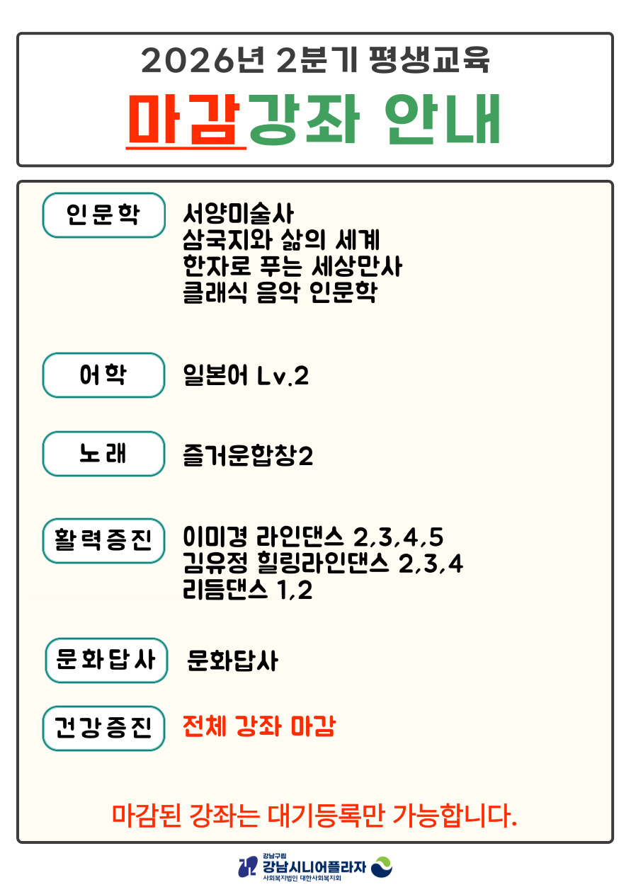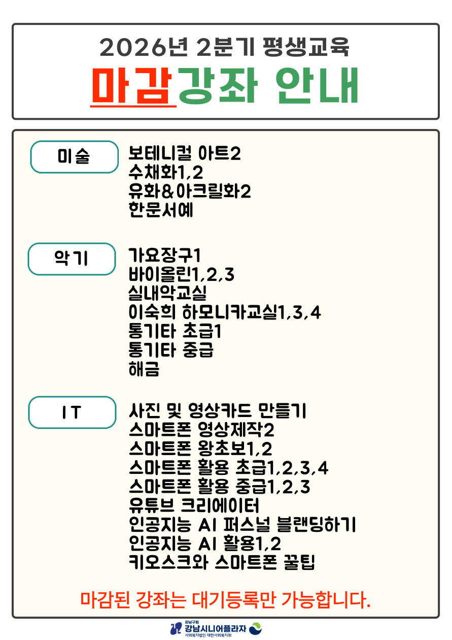[평생교육] 2026년 2분기 평생교육 프로그램 마감강좌 안내