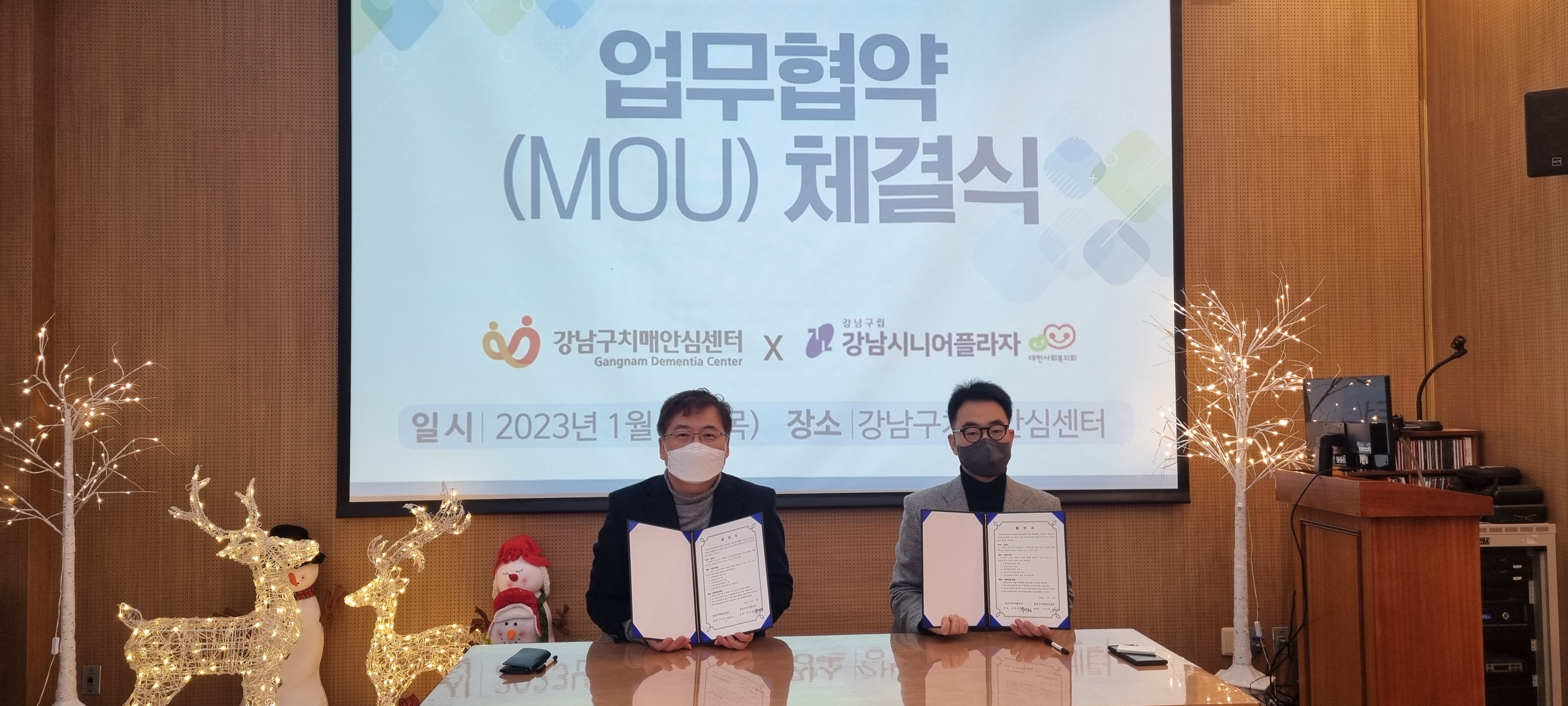 강남구치매안심센터와 상호 협력체계를 구축하여 치매관리사업을 활성화하는 업무협약을 맺었습니다.