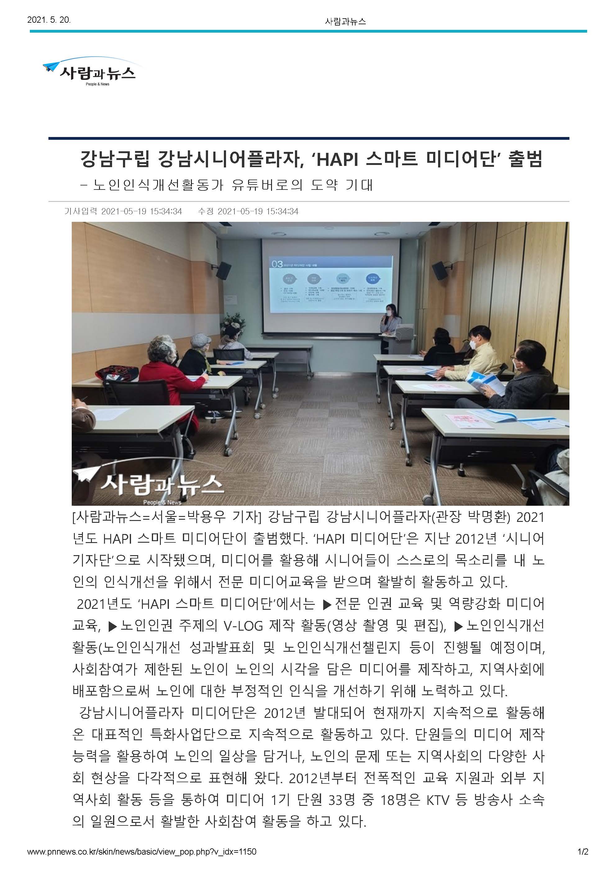 [2021.05.19 사람과뉴스] 강남구립 강남시니어플라자, 'HAPI스마트미디어단' 출범