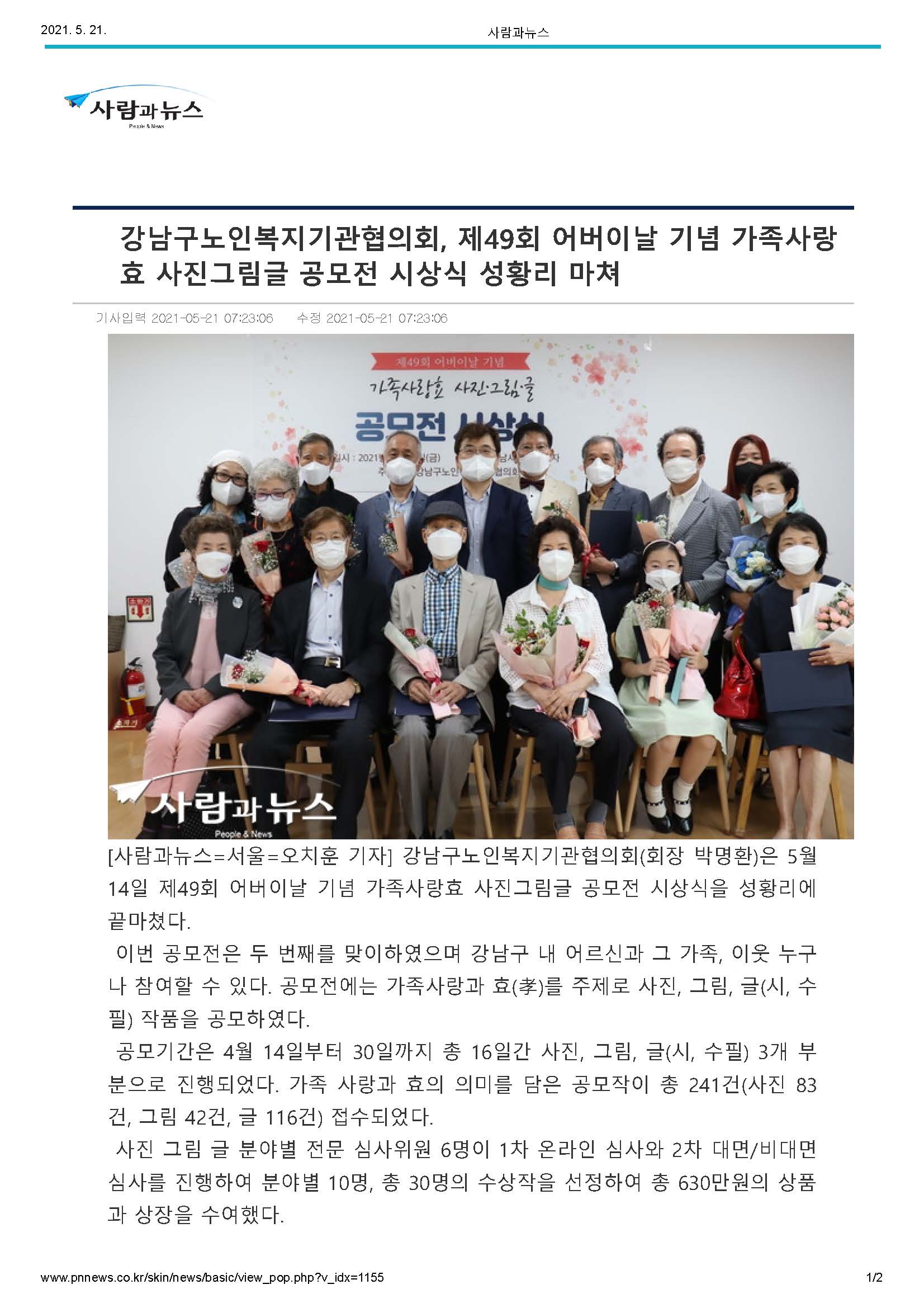 [2021.05.21 사람과뉴스] 강남구노인복지기관협의회, 제49회 어버이날 기념 가족사랑 효 사진그림글 공모전 시상식 성황리에 마쳐