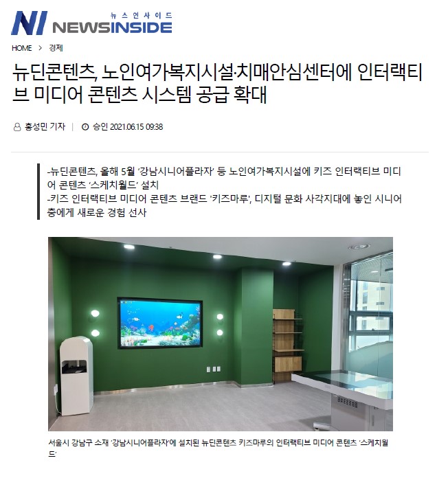 [2021.06.15 뉴스인사이드] 뉴딘콘텐츠, 노인여가복지시설,치매안심센터에 인터랙티브 미디어 콘텐츠 시스템 공급 확대