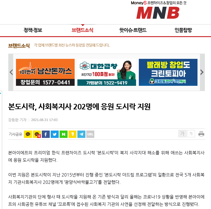 [2021. 8. 30 머니S] 본도시락, 사회복지사 202명에 응원 도시락 지원