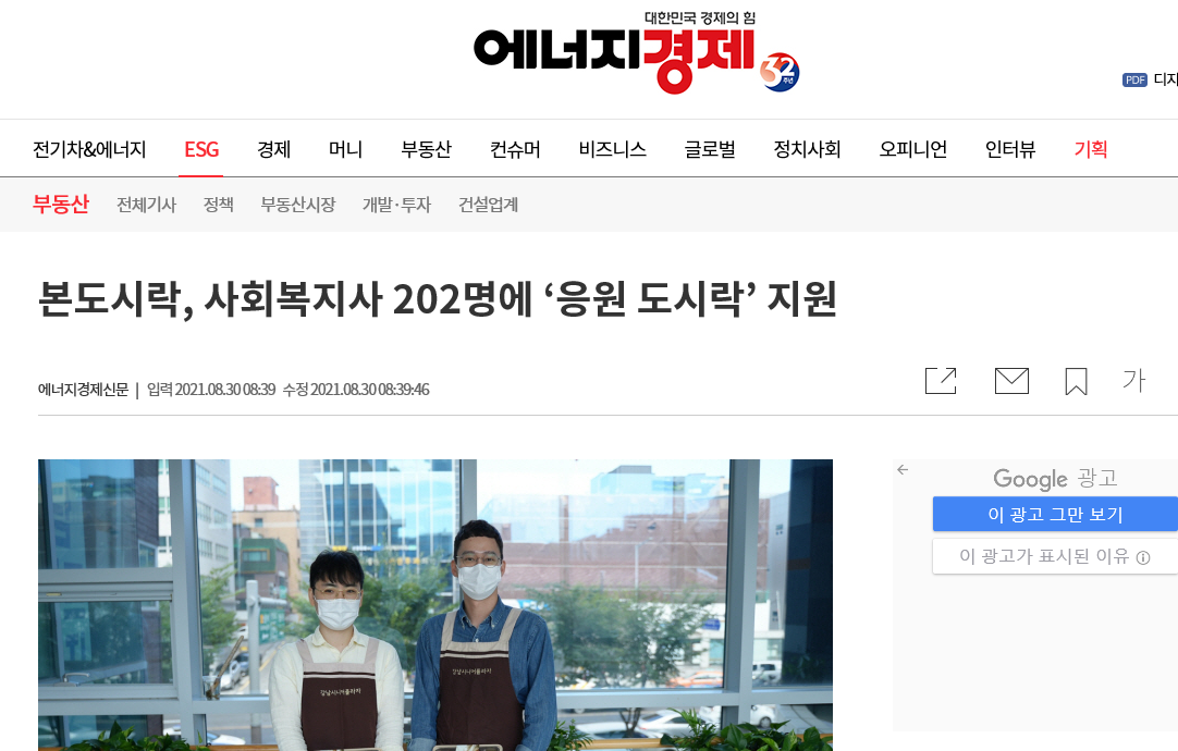 [2021. 8. 30 에너지경제] 본도시락, 사회복지사 202명에 응원 도시락 지원