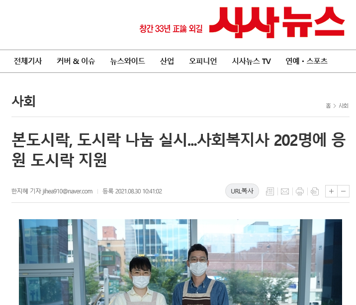 [2021. 8. 30 시사뉴스] 본도시락, 도시락 나눔 실시...사회복지사 202명에 응원 도시락 지원