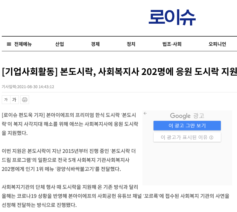 [2021. 8. 30 로이슈] 기업사회활동 본도시락, 사회복지사 202명에 응원 도시락 지원