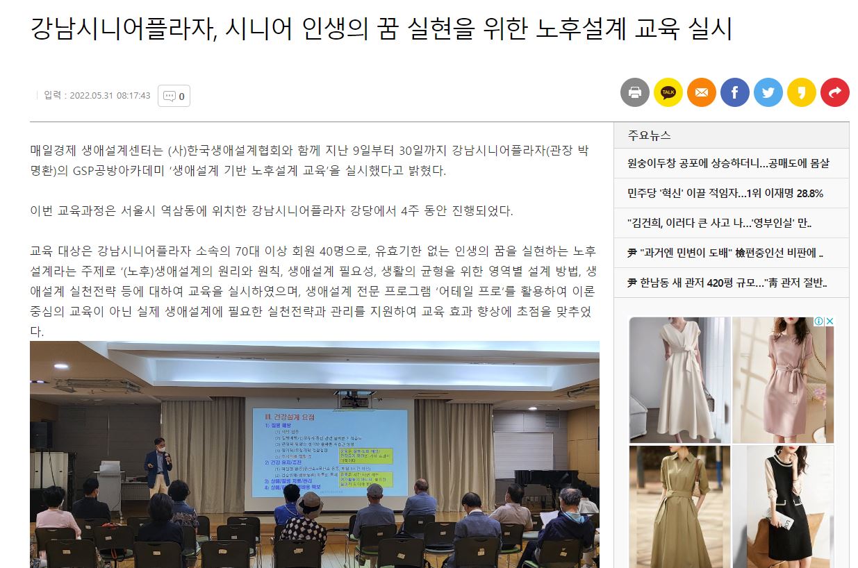 [2022.05.31 매일경제] 강남시니어플라자, 시니어 인생의 꿈 실현을 위한 노후설계 교육 실시