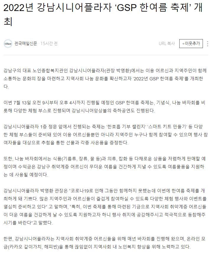 [2022.07.12 전국매일신문] 강남시니어플라자 GSP한여름축제 개최