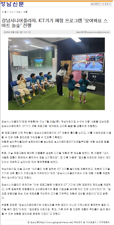 [2025. 8. 8. 강남신문] 강남시니어플라자 ICT기기 체험 프로그램 ‘모여봐요 스마트 놀숲’ 진행