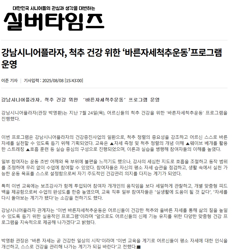 [2025. 8. 7. 실버타임즈] 강남시니어플라자, 척추 건강 위한 ‘바른자세척추운동’프로그램 운영