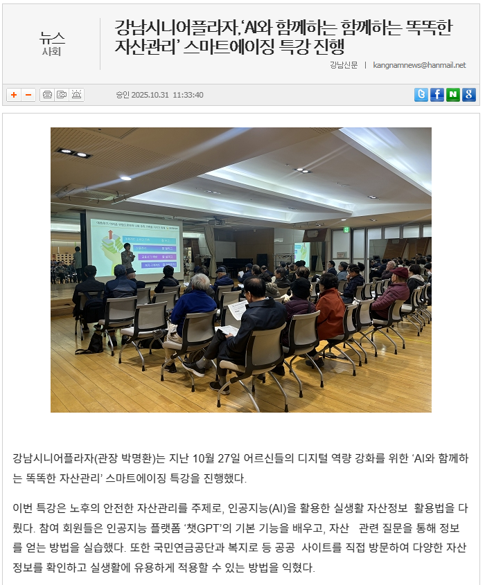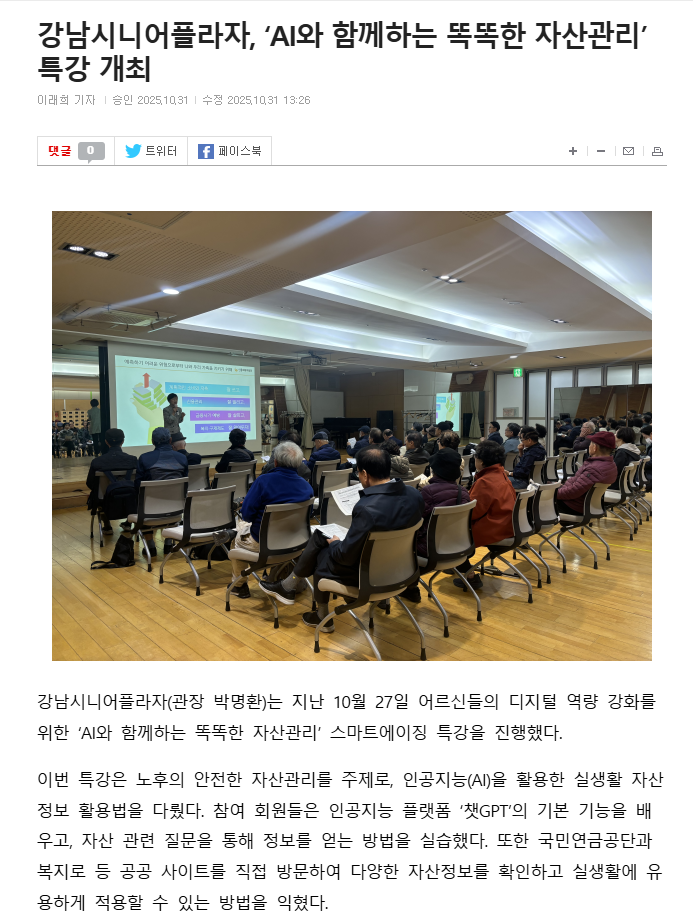 [2025.10.31. 강남내일신문 외 1건] 강남시니어플라자. AI와 함께하는 똑똑한 자산관리 특강 진행