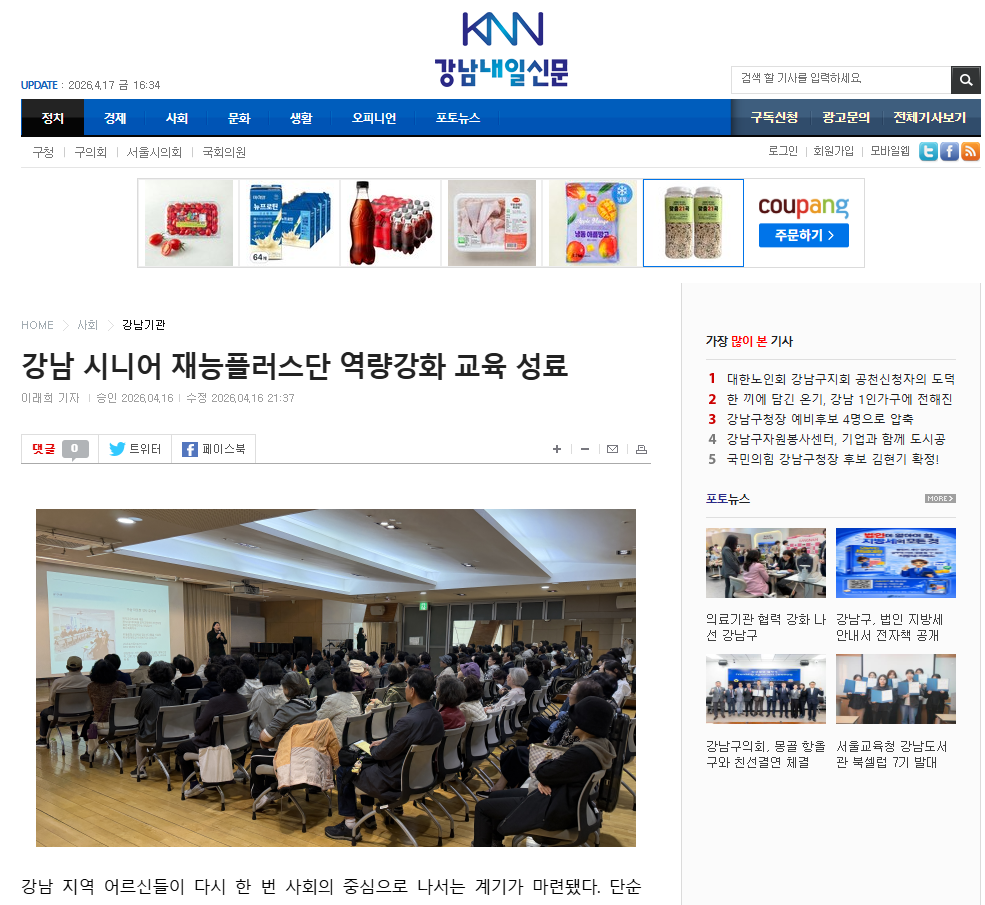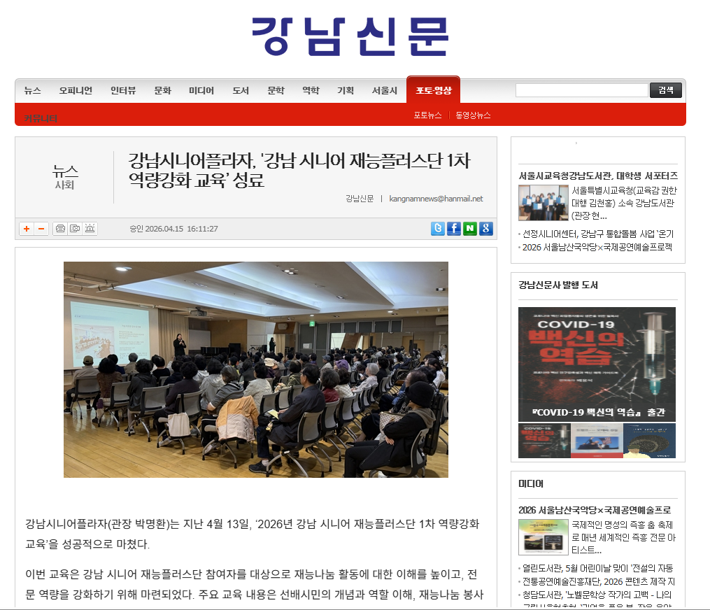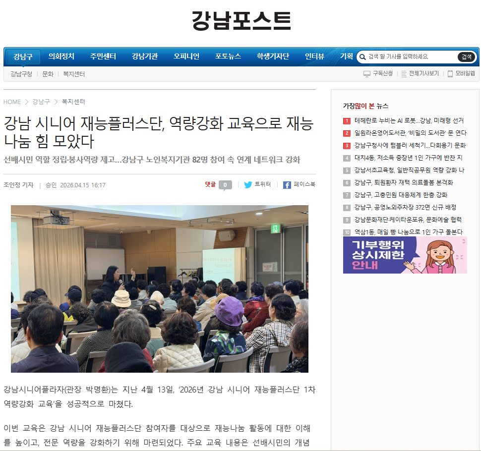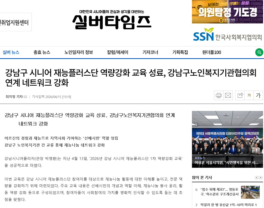 [2026.04.15. 실버타임즈 외 3건]강남시니어플라자, 강남 시니어 재능플러스단 1차 역량강화 교육 성료