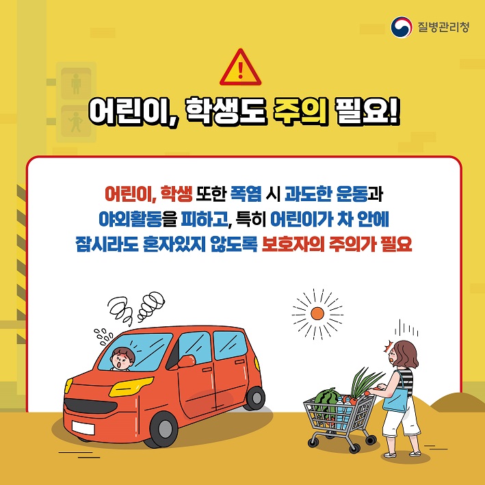어린이, 학생 또한 폭염 시 과도한 운동과 야외활동을 피하고, 특히 어린이가 차 안에 잠시라도 혼자있지 않도록 보호자의 주의가 필요합니다.