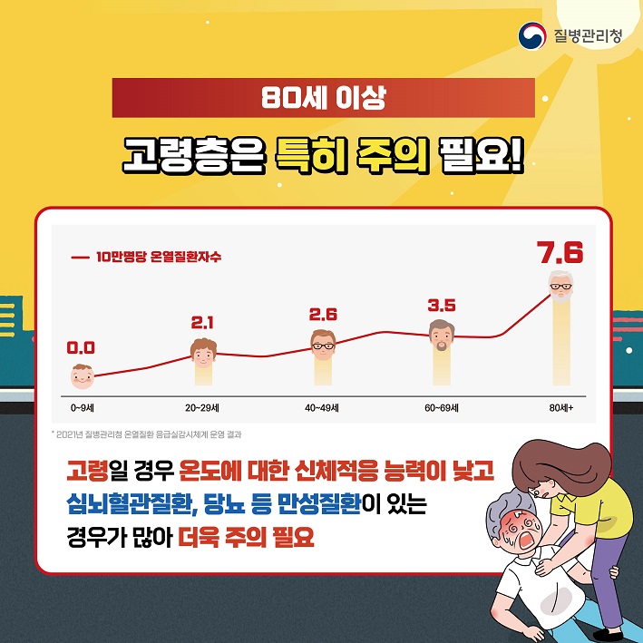 고령일 경우 온도에 대한 신체적응 능력이 낮고 심뇌혈관질환, 당뇨 등 만성질환이 있는 경우가 많아 더욱 주의가 필요합니다.