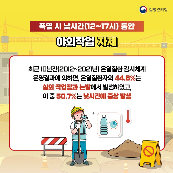 ■ 폭염 시 낮시간(12~17시) 동안 야외작업 자제해야 합니다!